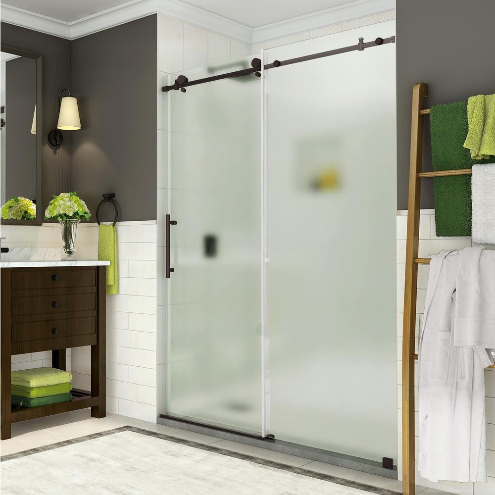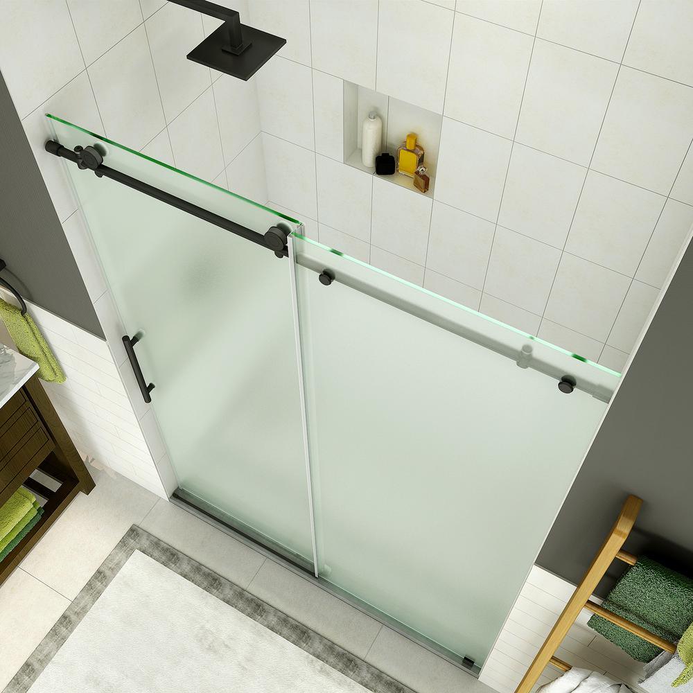 • 56 in. to 60 in. W x 76 in. H frameless sliding shower door with frosted glass