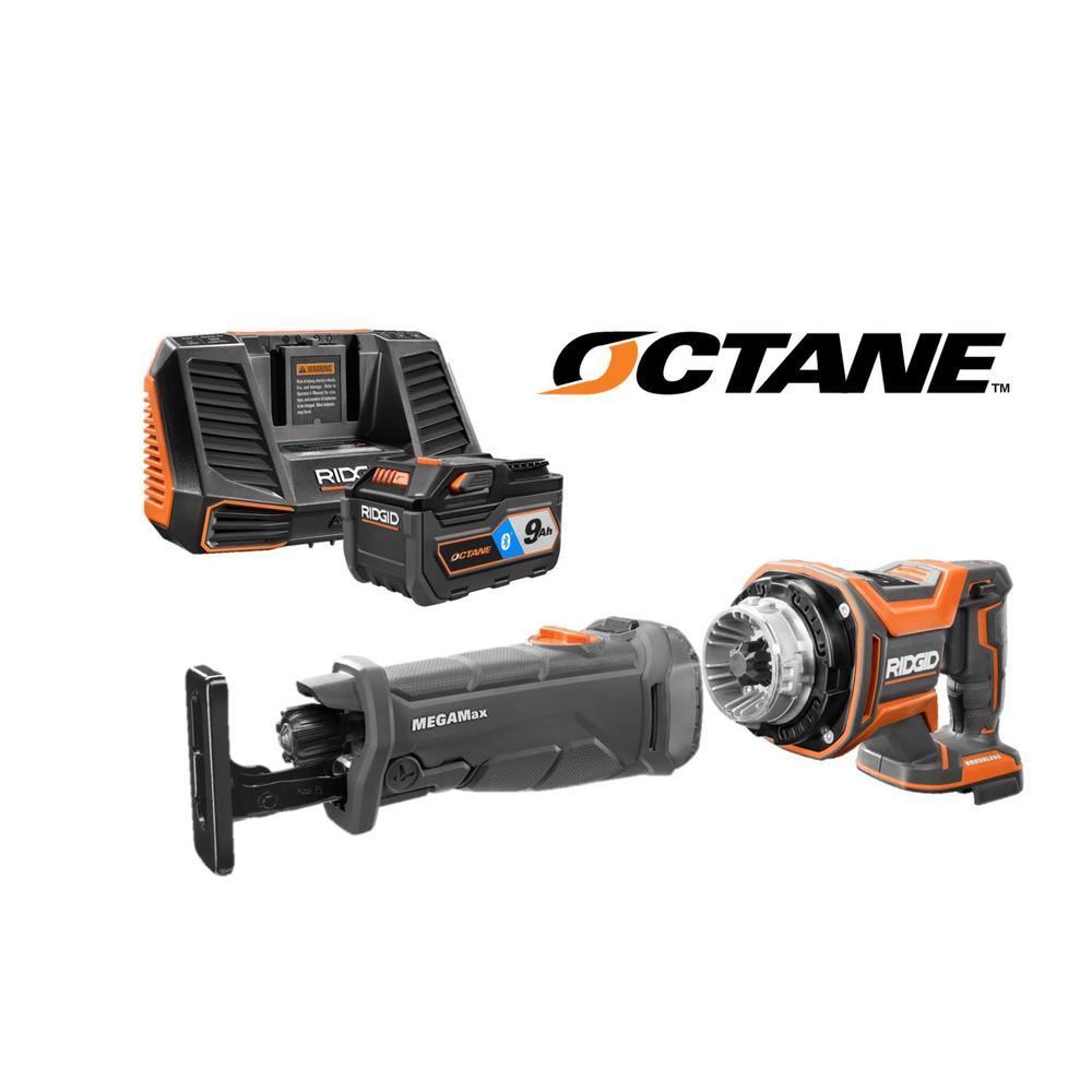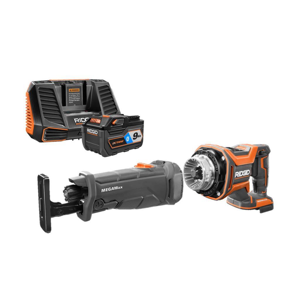 RIDGID introduces the 18-Volt OCTANE Brushless MEGAMax Power Base with MEGAMax Reciprocating Saw Attachmnet Head, 18-Volt OCTANE 9.0 Ah Lithium Battery, and Charger. The OCTANE MEGAMax Power Base features high performance brushless motors and advanced electronics that provide best-in-class power and intelligence. The MEGAMax family is the industry's most powerful interchangeable tool system. This Power Base automatically recognizes each Attachment Head and configures the settings to match. The OCTANE MEGAMax Reciprocating Saw Attachment Head features 4 directional head positions to allow the user to optimize ergonomics based on the application and the Sight Line Blower directs debris away from the cut line for increased visibility. With registration, this kit is backed by the Industry's Only Lifetime Service Agreement: FREE Parts. FREE Service. For LIFE. This set includes an 18-Volt OCTANE Brushless MEGAMax Power Base, an OCTANE MEGAMax Reciprocating Saw Attachment Head, an 18-Volt OCTANE 9.0 Ah Lithium-Ion Battery, an 18-Volt Charger, and operator's manuals.