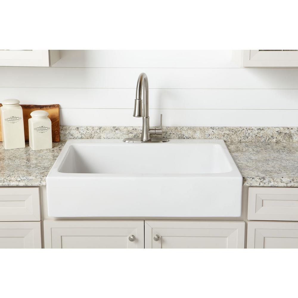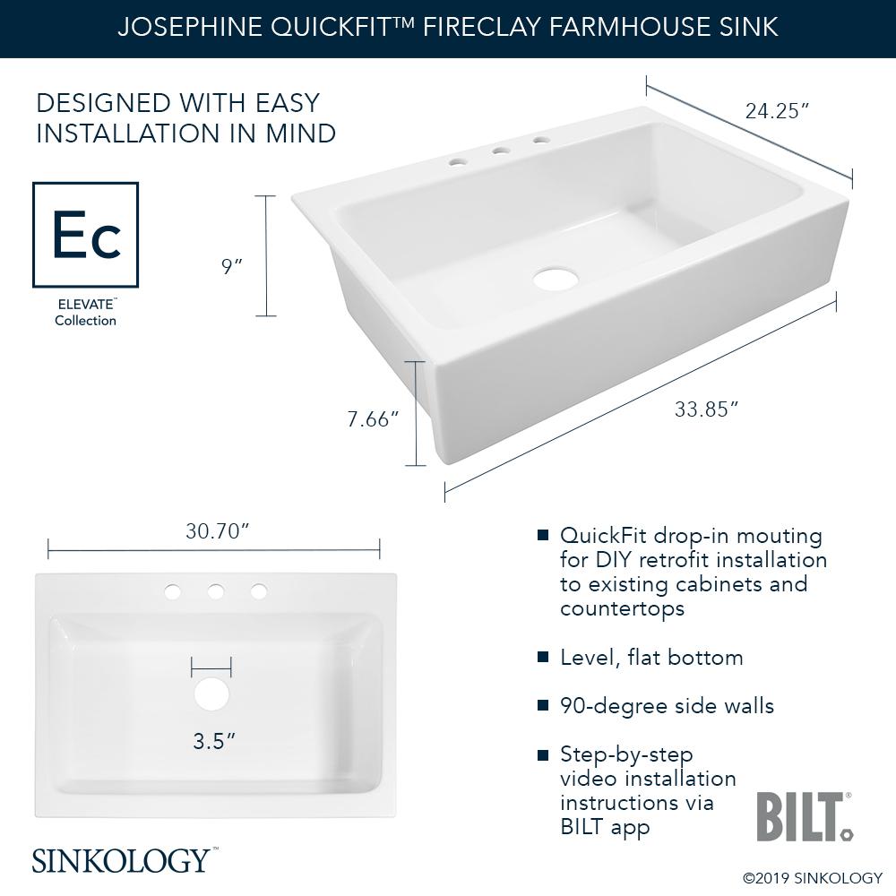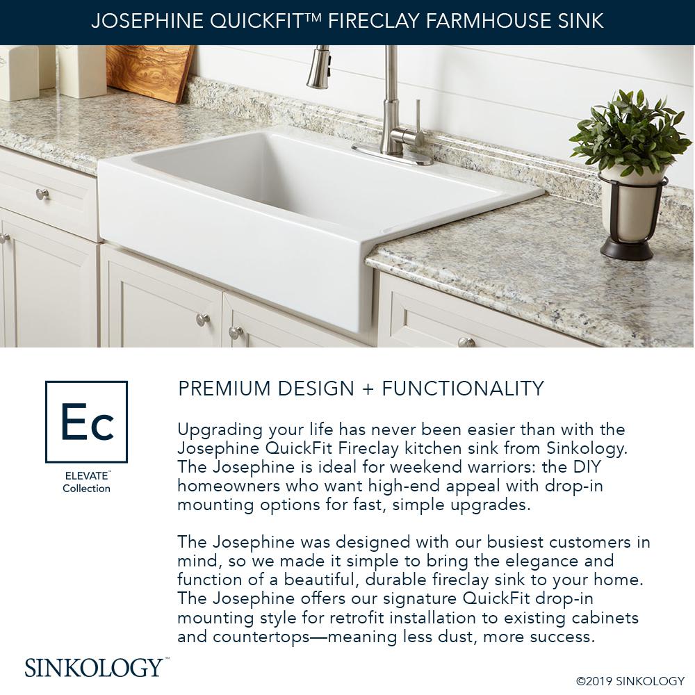 The Josephine Quick-Fit Fireclay kitchen sink brings SINKOLOGYs ELEVATE collection to your home. Our handcrafted single bowl sink showcases the classic beauty of the farmhouse style with modern enhancements for ultimate functionality. The Josephine Quick-Fit sink is designed to make installation easy and works with most existing counter tops and cabinets. Traditionally farmhouse kitchen sinks were heavy and difficult to install and usually required counter top and cabinet replacement. No longer are stylish and classic apron front farm sinks reserved for total kitchen make overs, SINKOLOGY and The ARB775W make updating your kitchen easy and affordable. The Josephine is designed to withstand the needs of a busy kitchen without sacrificing the classic look of an authentic farmhouse sink. The single bowl, apron-front sink features a crisp white finish that brings clean, timeless beauty to your kitchen. All SINKOLOGY sinks are guaranteed to not chip, crack, stain, or rust, and we back that promise with our exclusive SINKOLOGY Lifetime Warranty. The Josephine Quick-Fit single bowl farmhouse sink from our ELEVATE collection is functional, reliable, and priced with you in mind.