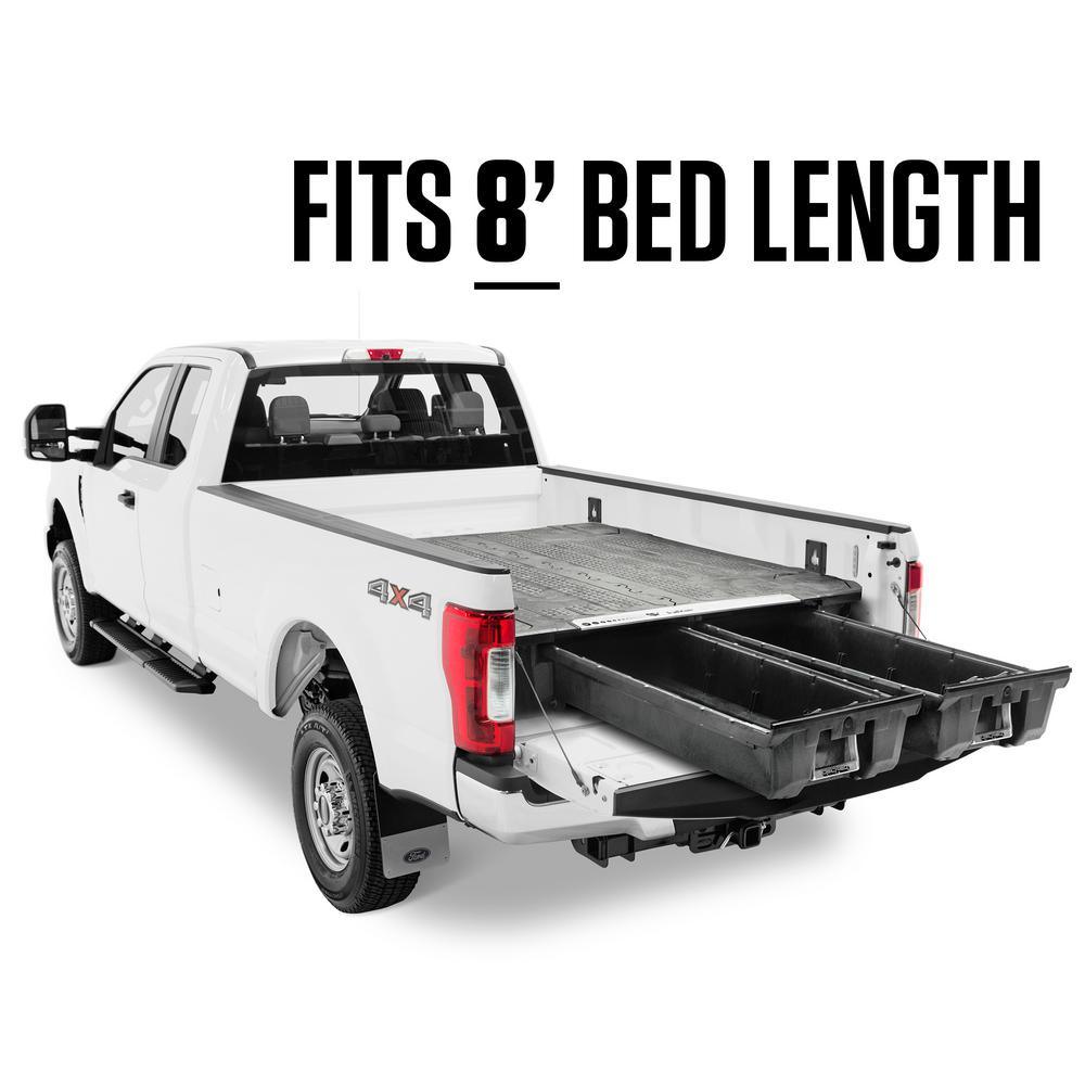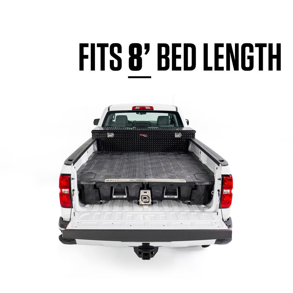 - SKUs are standard box DECKED systems engineered to be installed in trucks with 8 ft. beds, these are not 8 ft. L DECKED systems, with these SKUs, the DECKED system orients towards the tailgate, as a result, there is a gap from the cab side wall to the cab side edge of the DECKED system that allows room for a crossover tool box or fuel transfer tank