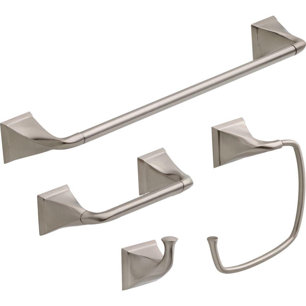 The Delta Everly Collection offers a transitional design, providing a nice combination of both contemporary and classic qualities. The square base of the post has an elegant, traditional feel while the twist feature adds a modern touch to the collection. The Everly Collection is ideal for baths with blended decor styles. This set includes a 24 in. towel bar, toilet paper holder, towel ring and towel hook. Add functionality and transitional style to your bath today with the Delta Everly 4-Piece Accessory Set.