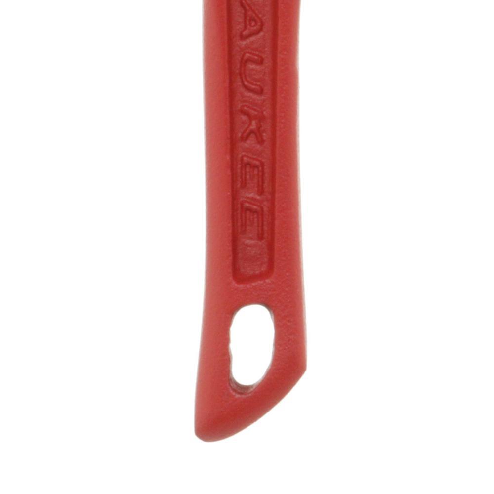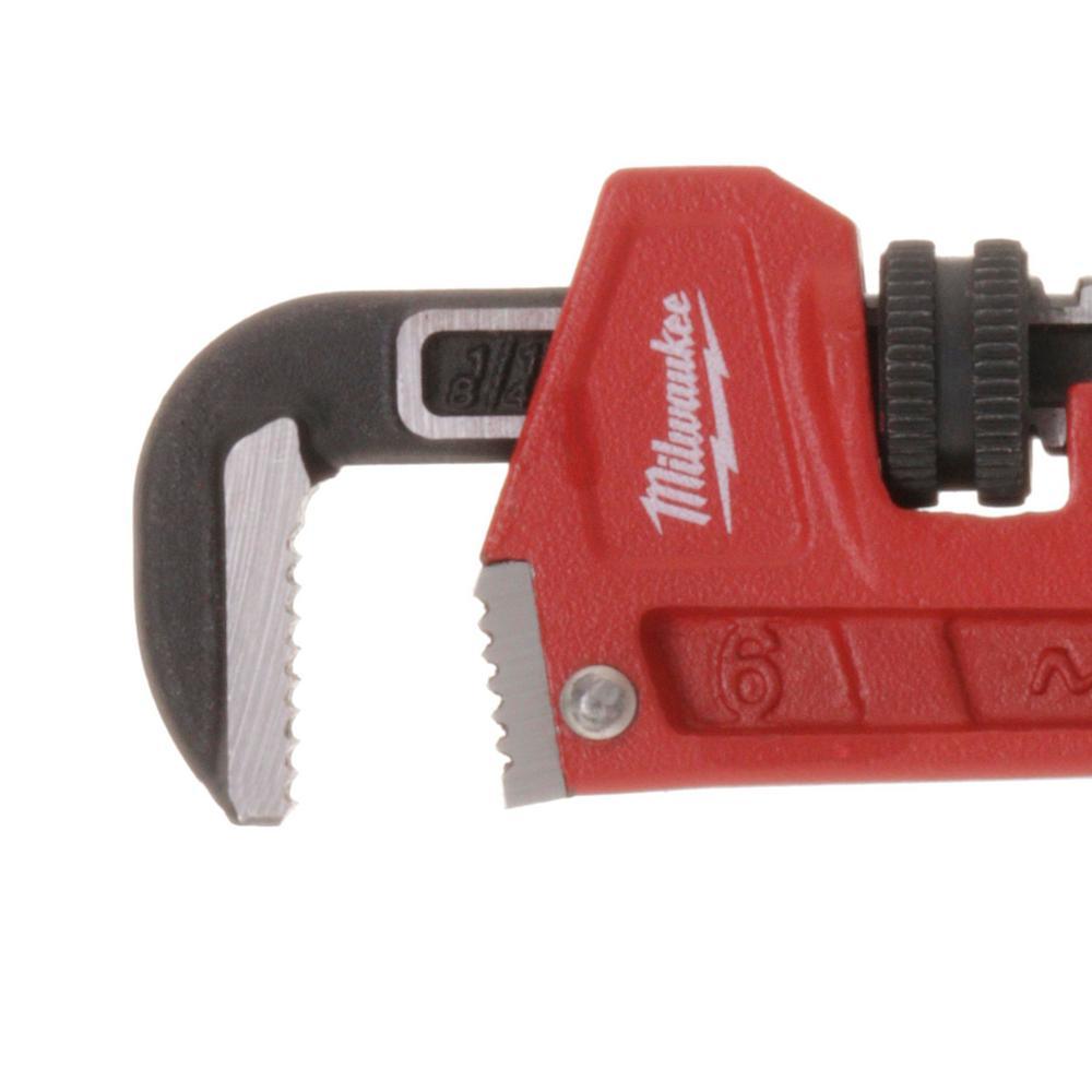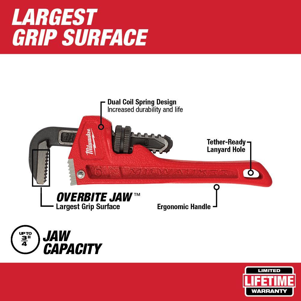 The MILWAUKEE 6-inch Steel Pipe Wrench has been designed from the ground up to deliver maximum productivity to professional users. The 6" pipe wrench features an OVERBITE JAW design delivering the largest gripping surface while using the wrench and a capacity of 3/4". Dual coil springs offer maximum durability and tool life. The wrench handle's ergonomic form has been designed for maximum comfort and wont dig into users' palms while in use. Tough hardened jaws offer increased grip and tooth durability while a tether-ready handle loop makes the 6 in. steel pipe wrench perfect for the toughest of job sites. Milwaukee Tool stands behind their product and offers a Limited Lifetime Warranty with all steel pipe wrenches.