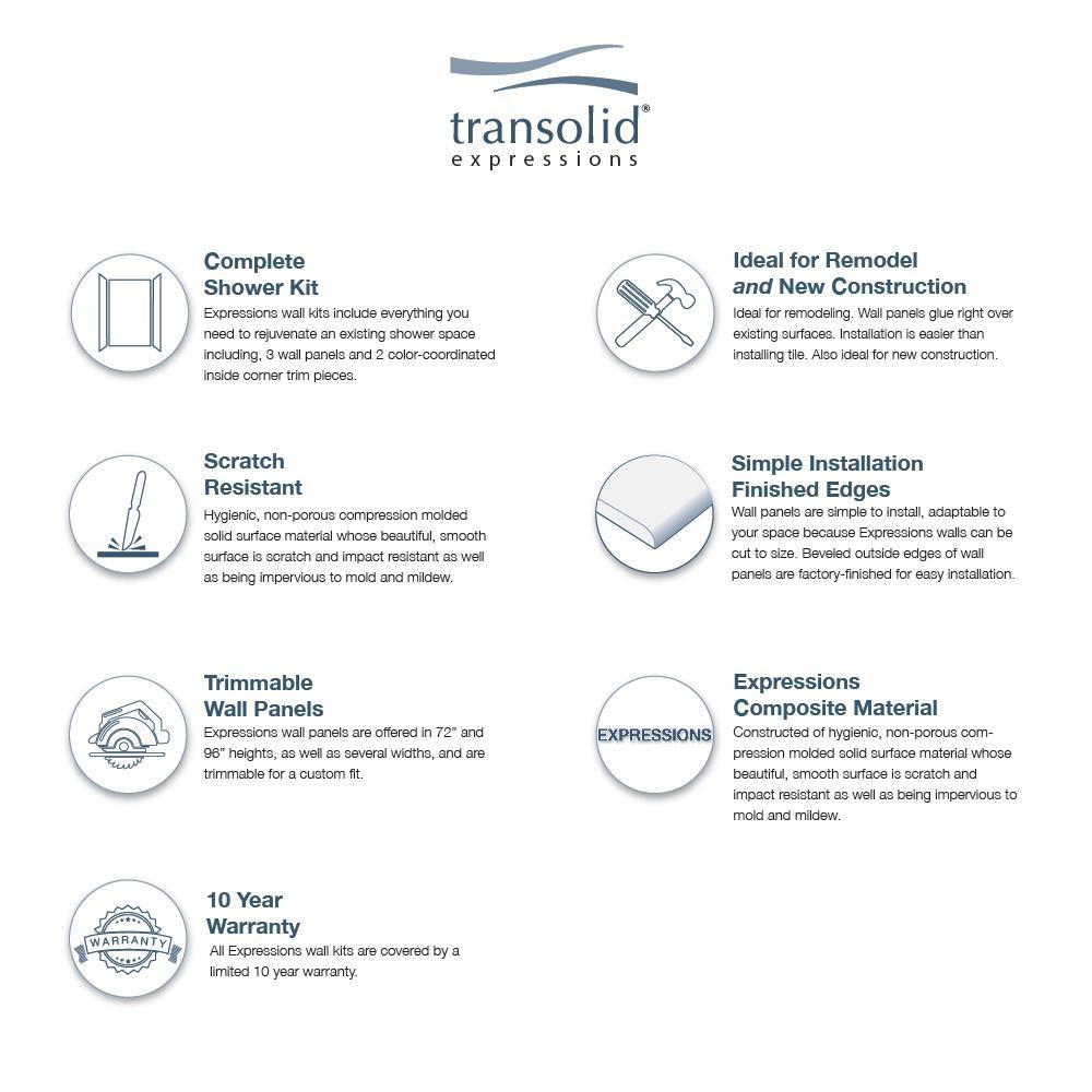 Transolid Expressions walls are made of SaraMar - hygienic, non-porous compression molded solid surface material that is right on trend in the latest colors and patterns. Wall panels are simple to install, adaptable to your space because Expressions walls can be cut to size. Outside edges of wall panels are factory-finished for easy installation. Expressions walls are durable, resistant to stain, virtually maintenance free. No mold and no mildew. Covered by a 10-year warranty.