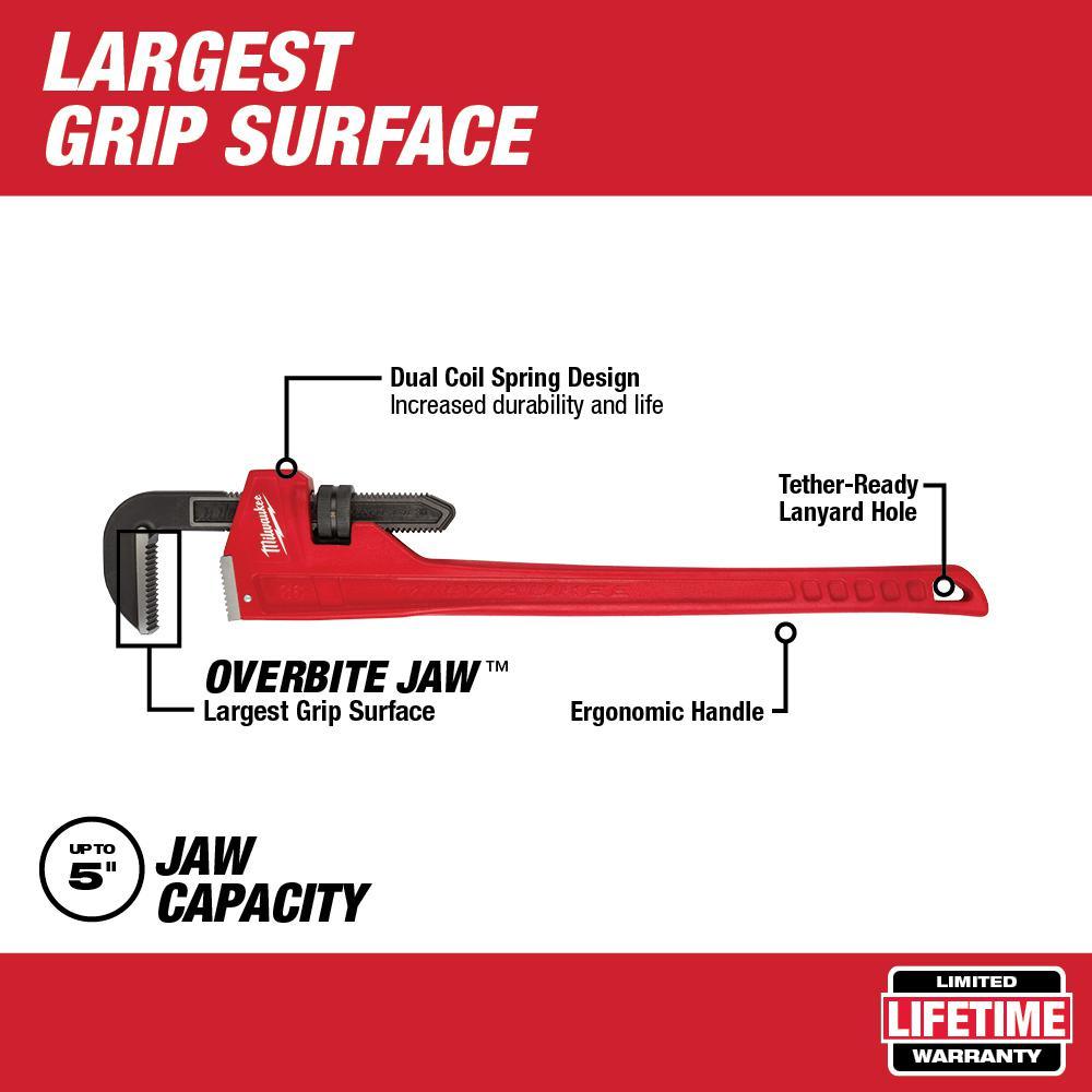 The MILWAUKEE 36-inch Steel Pipe Wrench has been designed from the ground up to deliver maximum productivity to professional users. The 36" pipe wrench features an OVERBITE JAW design delivering the largest gripping surface while using the wrench and a capacity of 5". Dual coil springs offer maximum durability and tool life. The wrench handle's ergonomic form has been designed for maximum comfort and wont dig into users' palms while in use. Tough hardened jaws offer increased grip and tooth durability while a tether-ready handle loop makes the 36 in. steel pipe wrench perfect for the toughest of job sites. Milwaukee Tool stands behind their product and offers a Limited Lifetime Warranty with all steel pipe wrenches.
