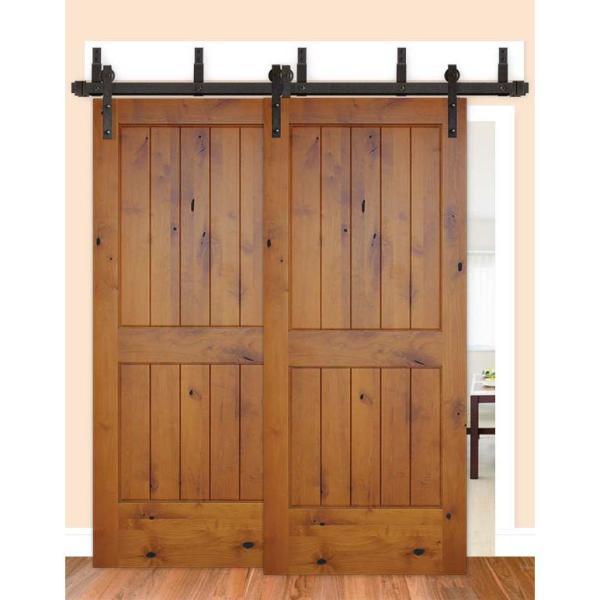 72 in. x 80 in. Bypass Rustic 2-PNL V-Groove Solid Core Knotty Alder Sliding Barn Door with Bronze Hardware Kit