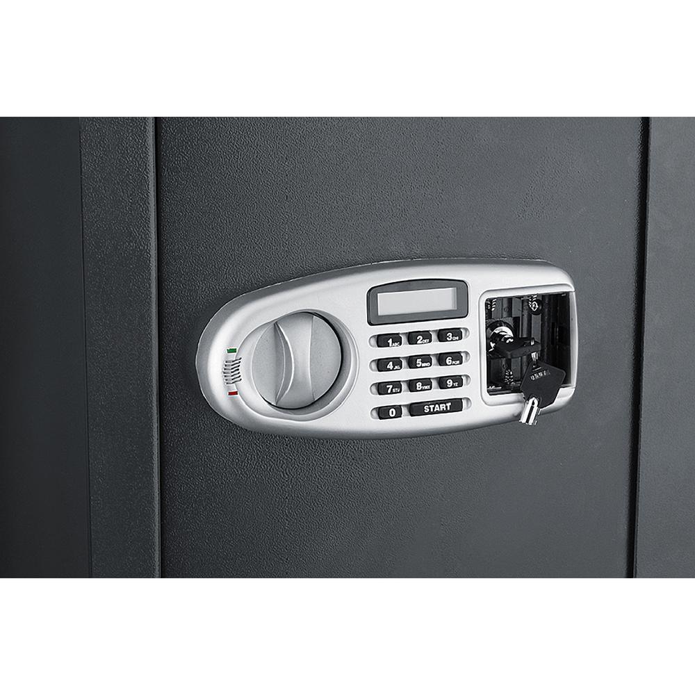 This is the Quarter Master FR7800 Digital Keypad Fire Resistant Home Office Security Safe. Easily store and keep valuables safe at home or office with this digital safe; works with included key or your own customized digital code you program. For added security, we've made the hinges concealed so they're tamper-proof. It is perfect for the home, office or work place. Features: Digital entry eliminates the need for making multiple key copies. Includes 1 Interior Shelf. Fire Rated. Total wall rated at 1700°F at 30-minutes. Can be programmed up to 2 PIN numbers (digit codes). Opens with secret PIN code or included keys. Safe door opens to the right. Pre-drilled holes inside the safe with fixing bolts allowing anchoring. Inside tamper-proof hinges. Size: 16.75 in. W x 19 in. H x 16.25 in. D. Interior Dimensions: 13 in. x 17 in. x 14 in. Double walls with fire resistant fiber insulation. Inner Layer Steel Thickness: 1.5 mm. Outer Layer Steel Thickness: 2 mm. Door Thickness: 5 mm. Finish: Epoxy Powder coating. Equipped with EA keypad electronic digital operating system. Removable Shelf. Key lock override system. Opens with secret PIN code or included keys (2 Free Keys). Simple programmable Electronic Lock with buzzer and LED. 3 to 8 numbers. Code can be changed infinitely. Runs on AASIZE (1.5-Volt) batteries. Constructed with solid steel to resist hand and mechanical tool attacks. Weight: 77 lbs. Color: Dark Grey.