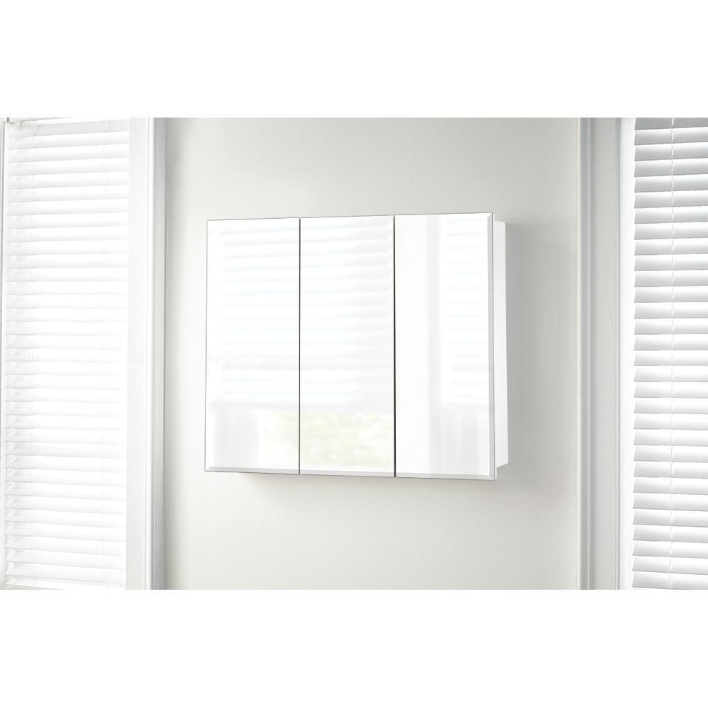 A perfect complement to any bathroom style, the Glacier Bay 36-3/8 in. W x 30-3/16 in. H x 4-1/4 in. D Frameless Surface-Mount Tri-View Bathroom Medicine Cabinet features beveled edges and a classic frameless design. Cabinet is white finish. The tri-view mirror offers multiple viewing angles for added functionality. The 2 adjustable shelves offers ample storage flexibility. Double shelf pegs enable you to customize your space quick and easy. Wood Composite construction provides exceptional durability and strength. Fully assembled for your convenience.