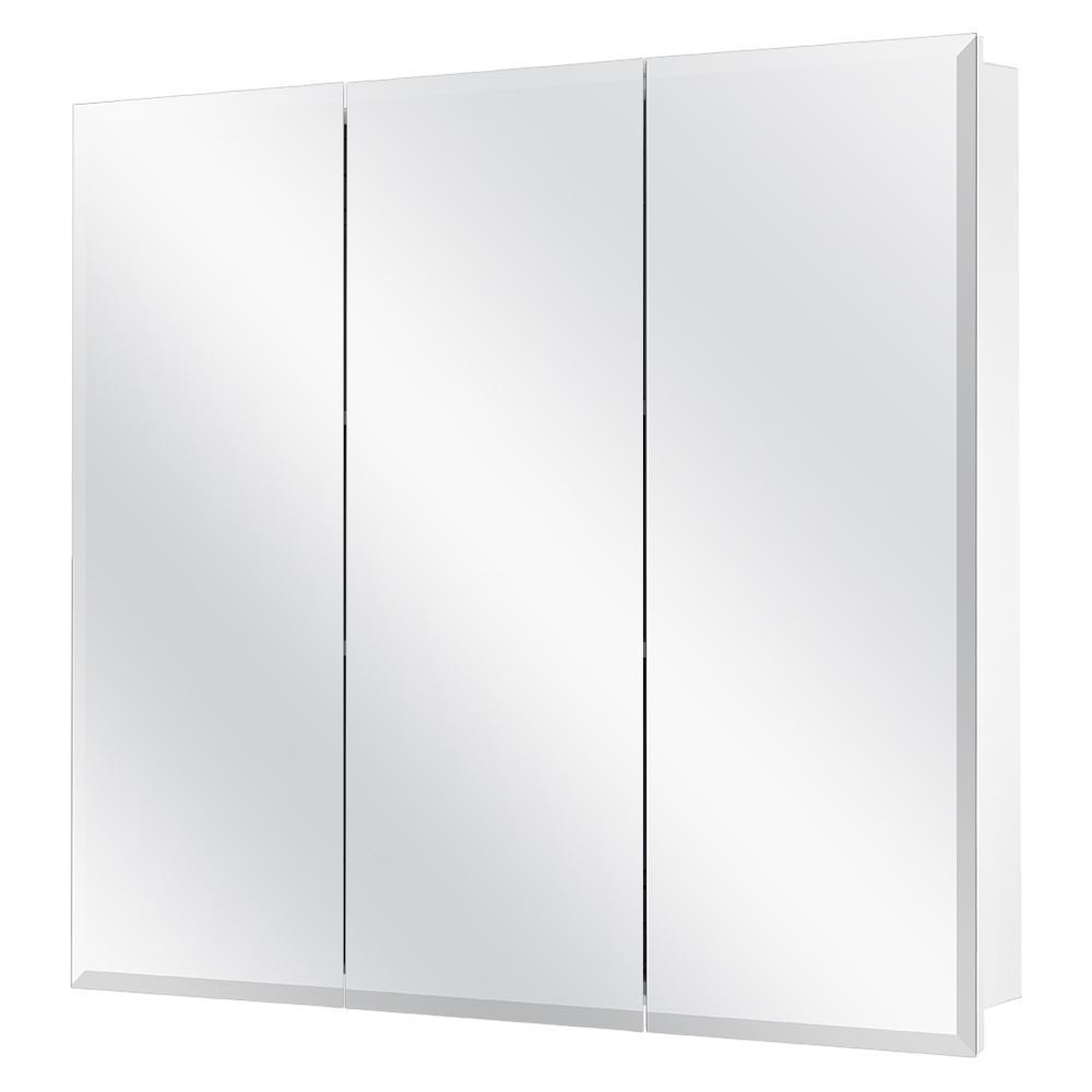 A perfect complement to any bathroom style, the Glacier Bay 30-3/8 in. W x 30-3/16 in. H x 4-1/4 in. D Frameless Surface-Mount Tri-View Bathroom Medicine Cabinet features beveled edges and a classic frameless design. Cabinet is white finish. The tri-view mirror offers multiple viewing angles for added functionality. The 2 adjustable shelves offers ample storage flexibility. Double shelf pegs enable you to customize your space quick and easy. Wood Composite construction provides exceptional durability and strength. Fully assembled for your convenience.