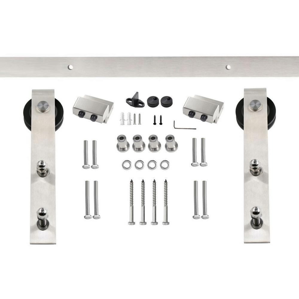 Delaney's 8 ft. Barn door 1000 Series Hardware Kit in satin nickel finish adds a distinctive, stylish upgrade to your home while optimizing space. Our Barn Door hardware delivers quiet wheels and durability to hold up to 330 lbs. Includes everything needed for installation making the process quick and hassle free. Steel construction and quality craftsmanship ensure that you will enjoy this product in your home for years to come. Kit includes, 2 hangers with quiet bearing wheels, 1 pre-drilled track, 6 standoffs and 6 lag bolts, 2-door stops, 1-door guide, 1 anti-jump disc, 6 bolts, 6 nuts and 6 washers for single doors 1-3/8 in. and 1-3/4 in. T.