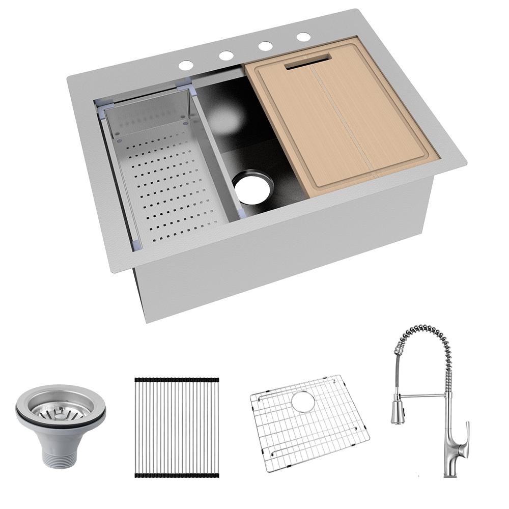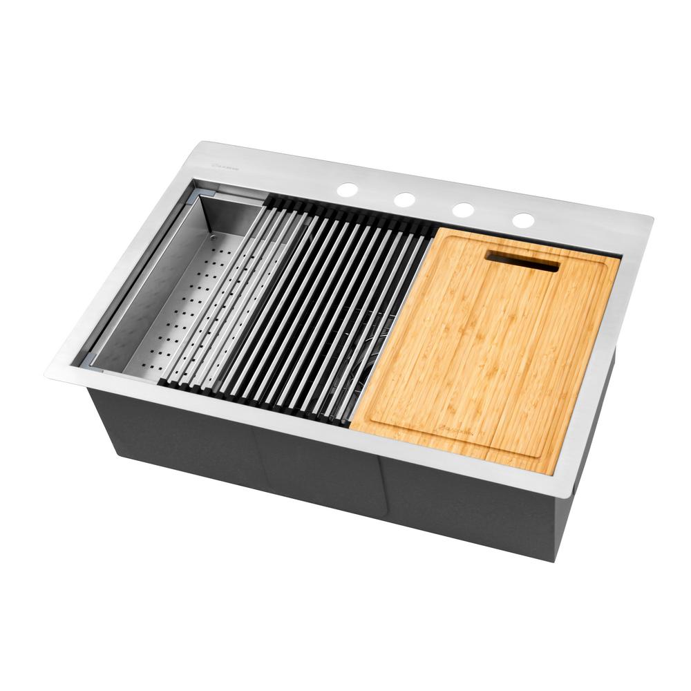 - Includes bamboo CUTTING BOARD, deep STAINLESS STEEL COLANDER, and dish-drying ROLL-UP RACK that slide on the ledges converting your sink to a workspace. Also included in box: Sink, Bottom Rinse Grid, Strainer Drain, Cutout Template, Mounting Clips and Installation Manual