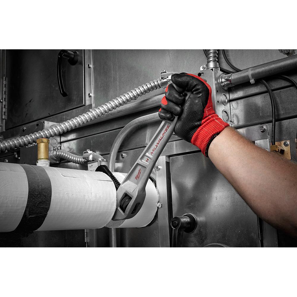 The Milwaukee 14 in. Aluminum Offset Pipe Wrench has been designed from the ground up to offer maximum productivity to the professional user. The 14 in. offset pipe wrench head offers users better access in tight spaces and is especially ideal for overhead applications. The jaw opening is parallel to the handle for easier use and features a 2 in. capacity. The ergonomic handle form has been designed to provide users maximum comfort and wont dig into users' palms while in use. Milwaukee stands behind their product and offers a Limited Lifetime Warranty with all aluminum offset pipe wrenches.
