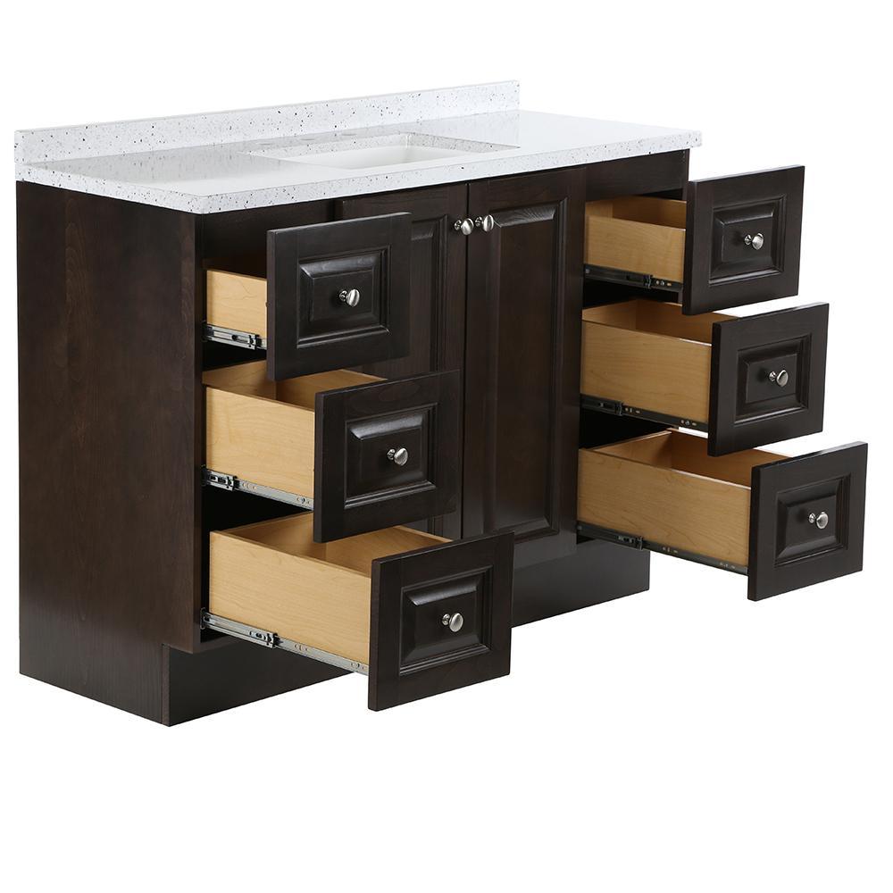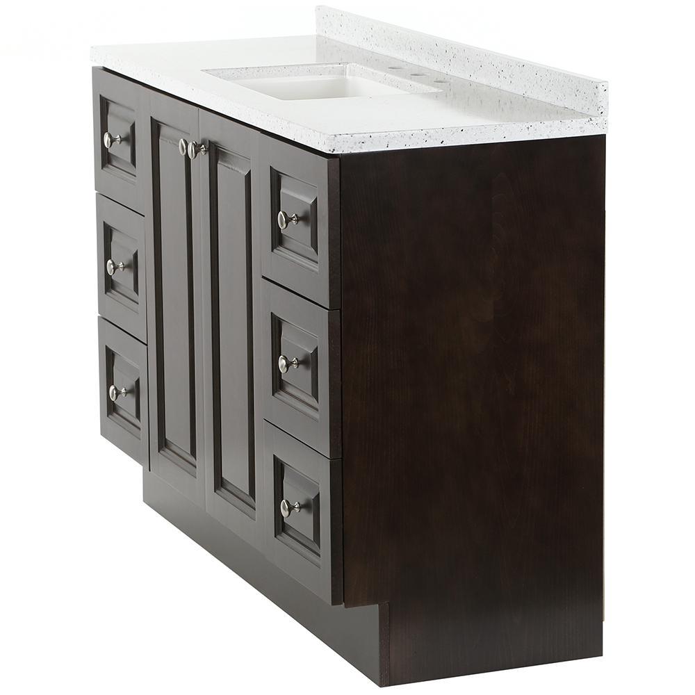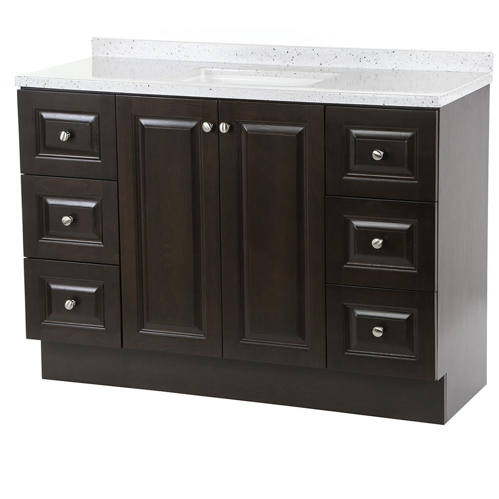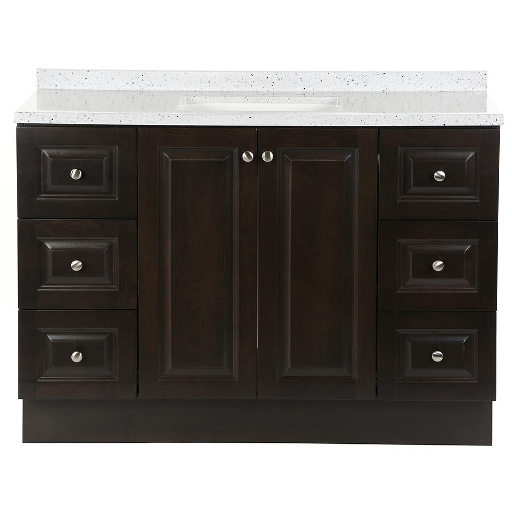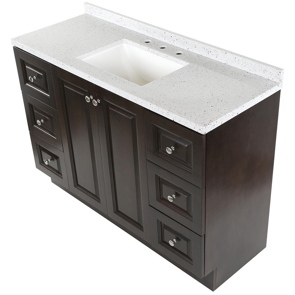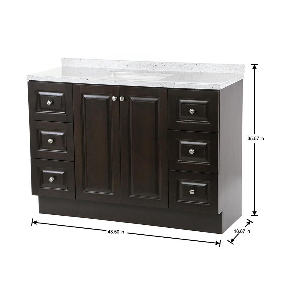 ​The Glacier Bay Northwood 48.5 in. vanity in Dusk with Solid Surface vanity top in Silver Ash has traditional styling that will complement a wide variety of home decor. The vanity offers plenty of storage space for your essentials with a large cabinet concealed by 2 raised panel doors and 6 full extension left and right hand side drawers. The Silver Ash vanity top is 2-toned with a snow white base and white, cream/eggshell, gray, and black accents and a white integral rectangular sink bowl. Decorated with smooth brushed nickel hardware, the Northwood vanity is a breathtaking choice for anyone wishing to upgrade their space.