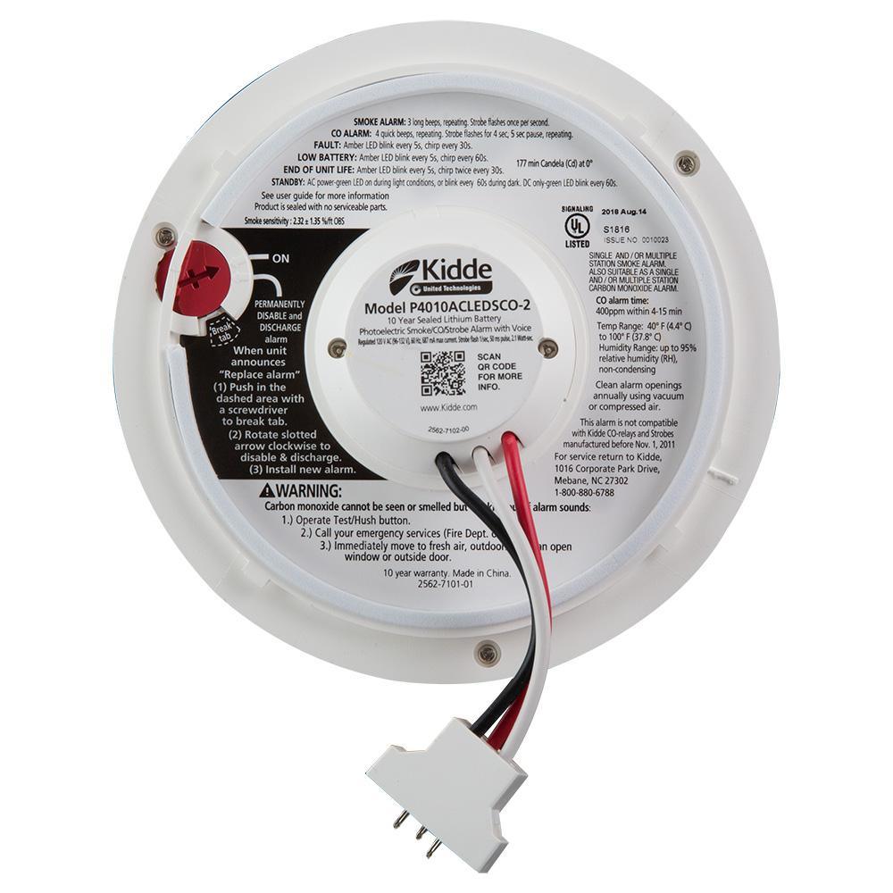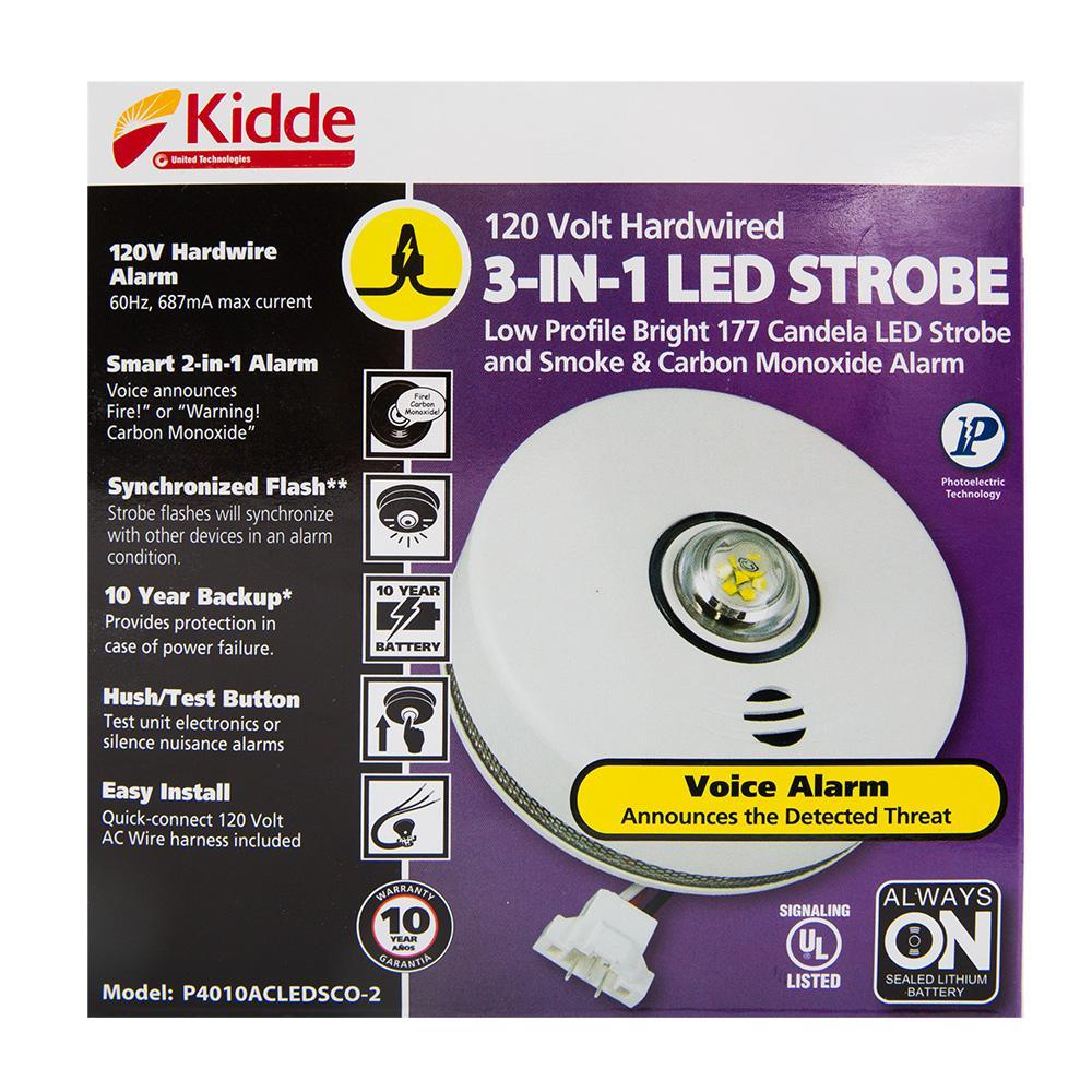The Kidde P4010ACLEDSCO-2 is an integrated 120-Volt AC wire-in smoke and carbon monoxide (CO) alarm with 10-year sealed battery backup and LED strobe light that provides temporal patterns, visual and voice warnings. If smoke is detected, the P4010ACLEDSCO-2 will produce a steady flash warning (once per second) and sound 3 long beeps, followed by Fire, repeating. During a CO incident the strobe horn will sound four (4) short beeps, followed by Warning. Carbon Monoxide repeating every 5 seconds. The LED ring will flash red in conjunction with the audible beeps. In an alarm condition, strobe flashes will synchronize with other interconnected P4010ACLEDS-2 and/or P4010ACLEDSCO-2 alarms. The P4010ACLEDSCO-2 is UL Listed and has a 10-year limited warranty.