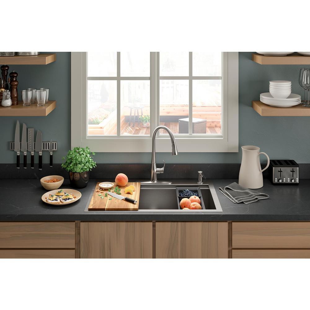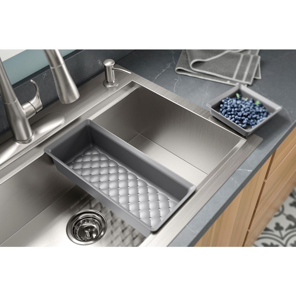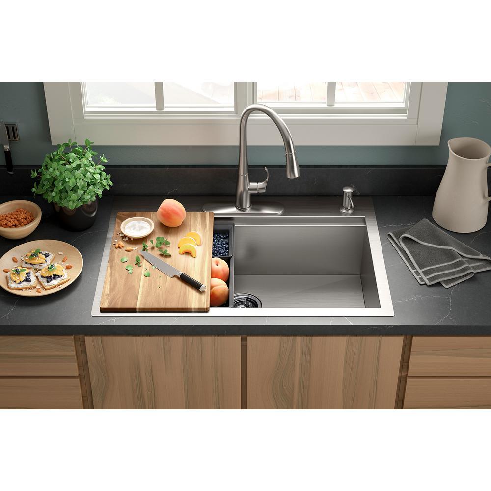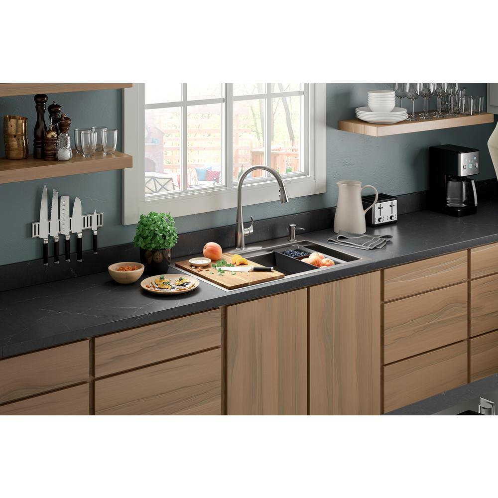 Find your kitchen rhythm with the Lyric Workstation sink. Custom-fit colanders and cutting board stack and slide along the sink rim, so your prep area is right above the basin. Move seamlessly from one task to the next, making cooking and entertaining easier. This dual-mount sink gives you the flexibility of top- or under-mount installation.
