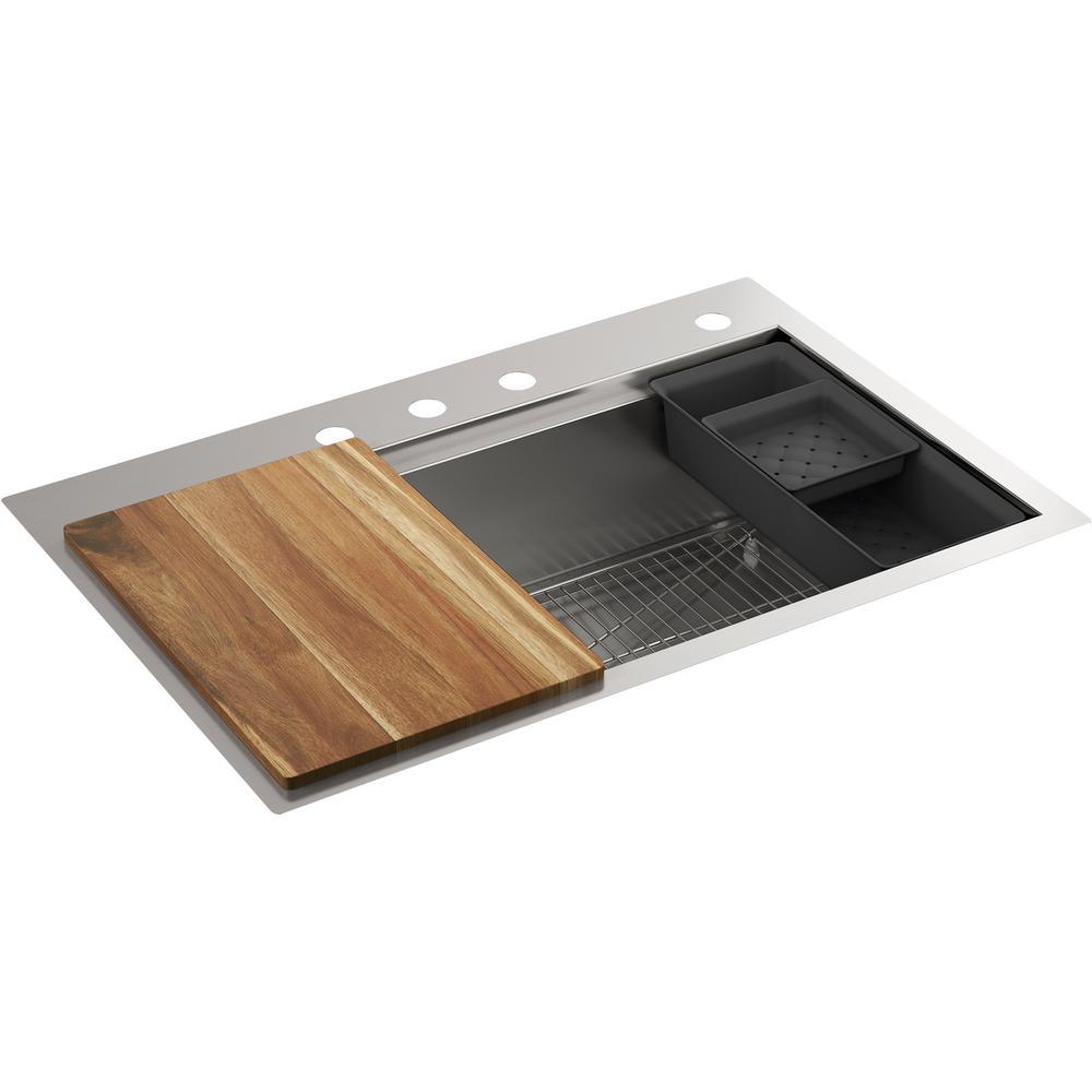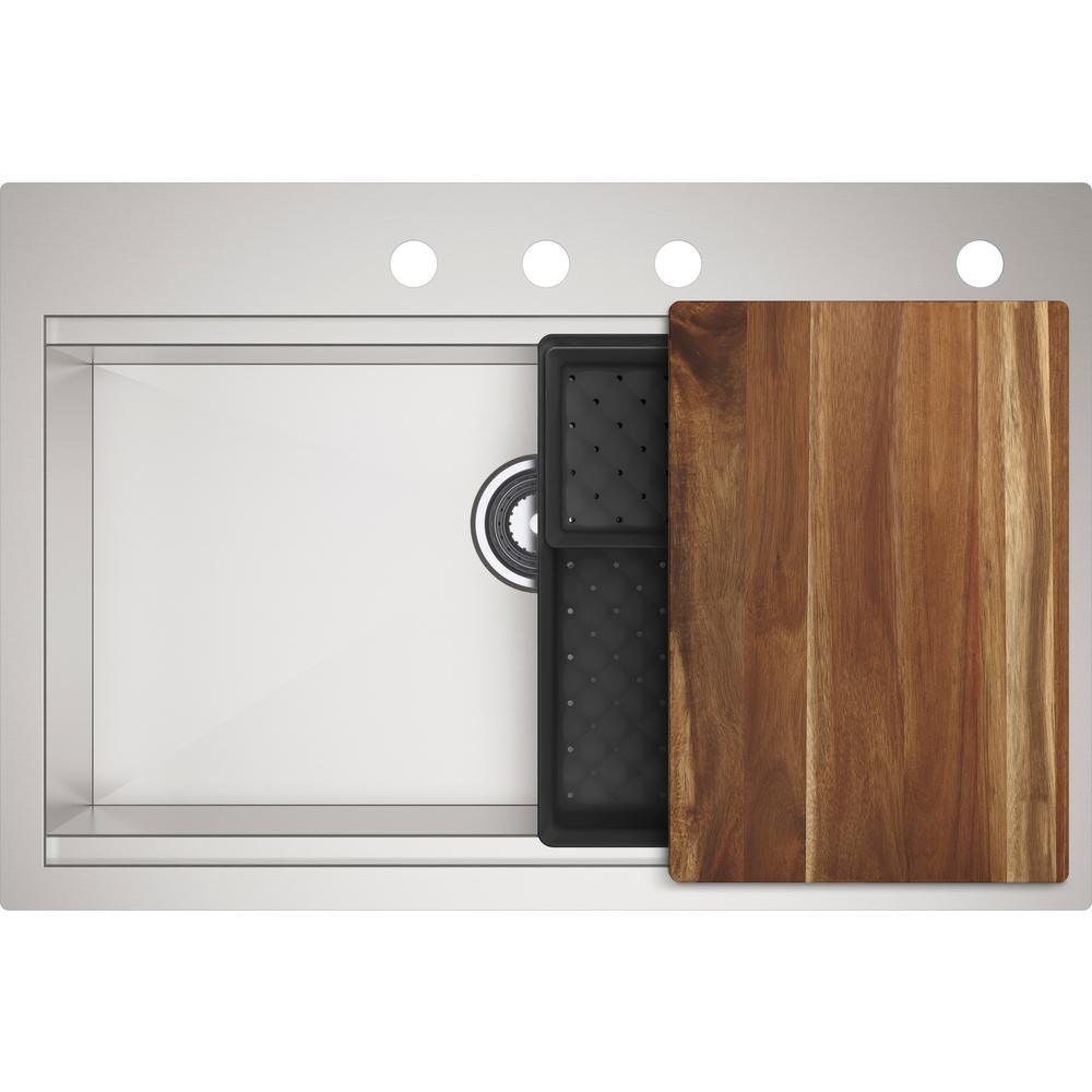 Lyric Dual Mount Workstation Stainless Steel 33 in 4-Hole Single Bowl Kitchen Sink with Integrated Ledge and Accessories