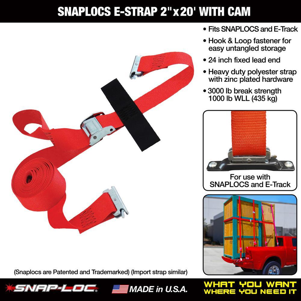 This Logistic E-Strap with quick release Cam buckle securely fastens to SNAP-LOC E-track Singles and E-track. SNAP-LOC's are the fastest, Safest and Easiest way to strap stuff where You Need It on pickups, trucks, trailers, racks, walls, ceilings, floors and more. You've probably wasted lots of time and money buying the same old junky hook straps that come loose and tangle into a frustrating ball of spaghetti. E-Strap has spring loaded ends that lock in place and are much safer than hook straps. SNAP-LOC E-Straps save you time with tangle resistant thicker webbing and sewn in Hook and Loop Storage Fastener, they save you money with a quality strap that far outlasts standard import straps. E-Strap is made from thick 2 in. W heavy-duty polyester webbing with built-in Cam Buckle, 24 in. lead end and overall length of 20 ft. Rated at an enormous 3,000 lbs. break strength and 1,000 lbs. working load limit (1,360 kg/454 kg). SNAP-LOC E-Straps give you Ultimate Cargo Control and also fit with other industry standard E-track accessories. Only "The SNAP-LOC System" offers a permanent comprehensive solution for all your cargo management needs with a coordinating variety of Straps, Accessories, Dollies, Carts and more. (SNAP-LOC is a trademarked system with patent protected exclusive products).