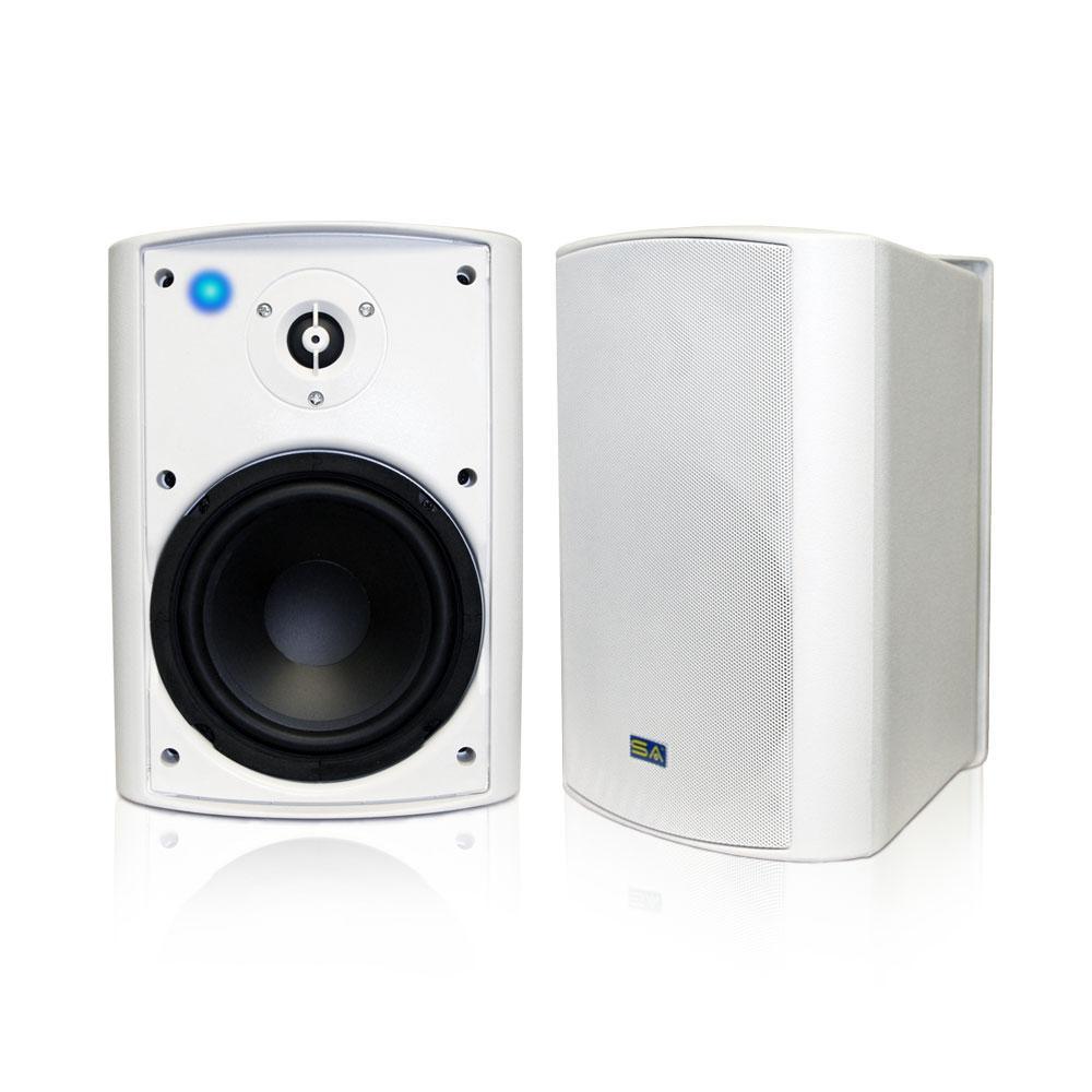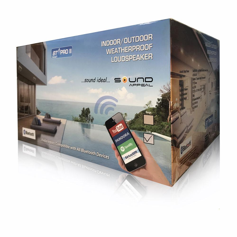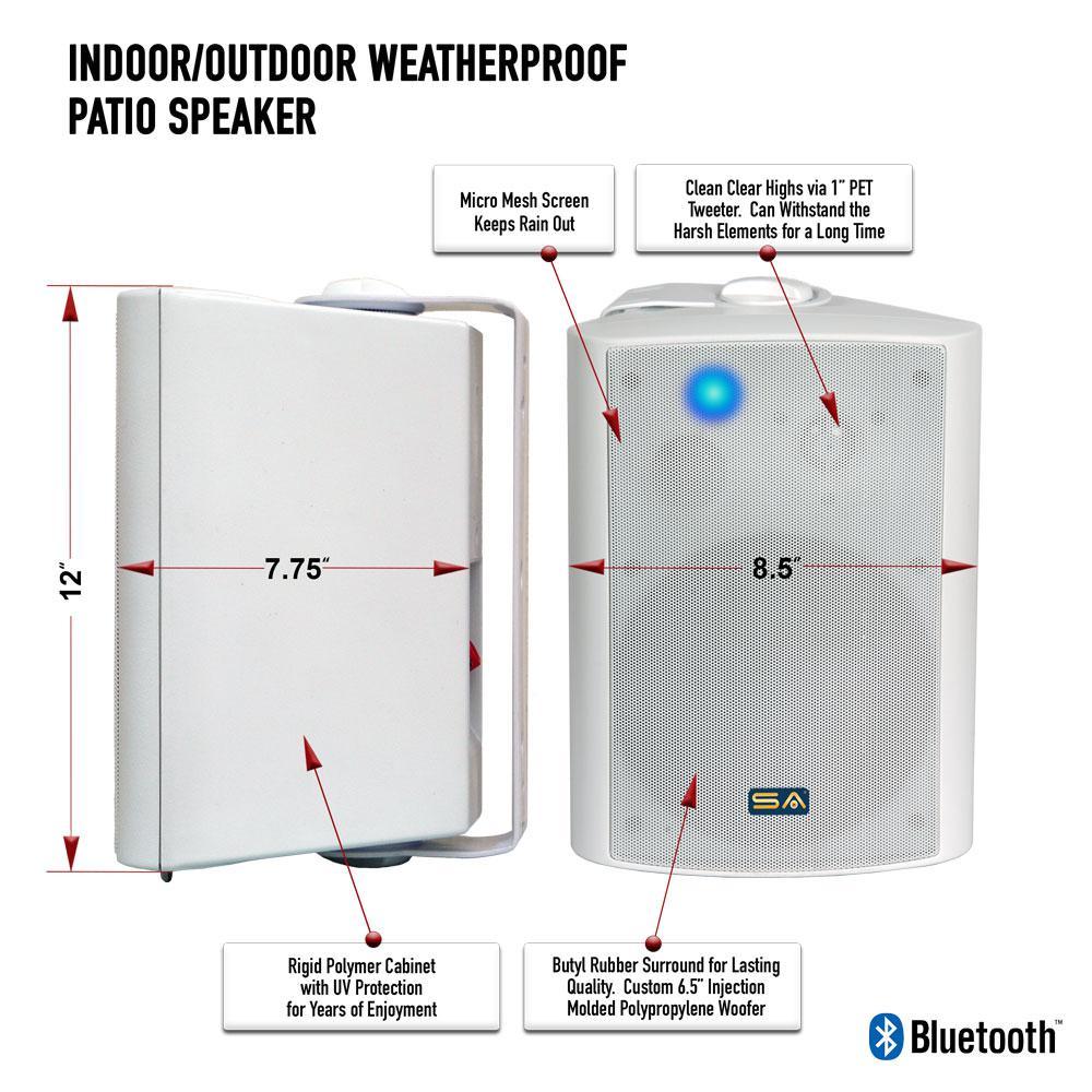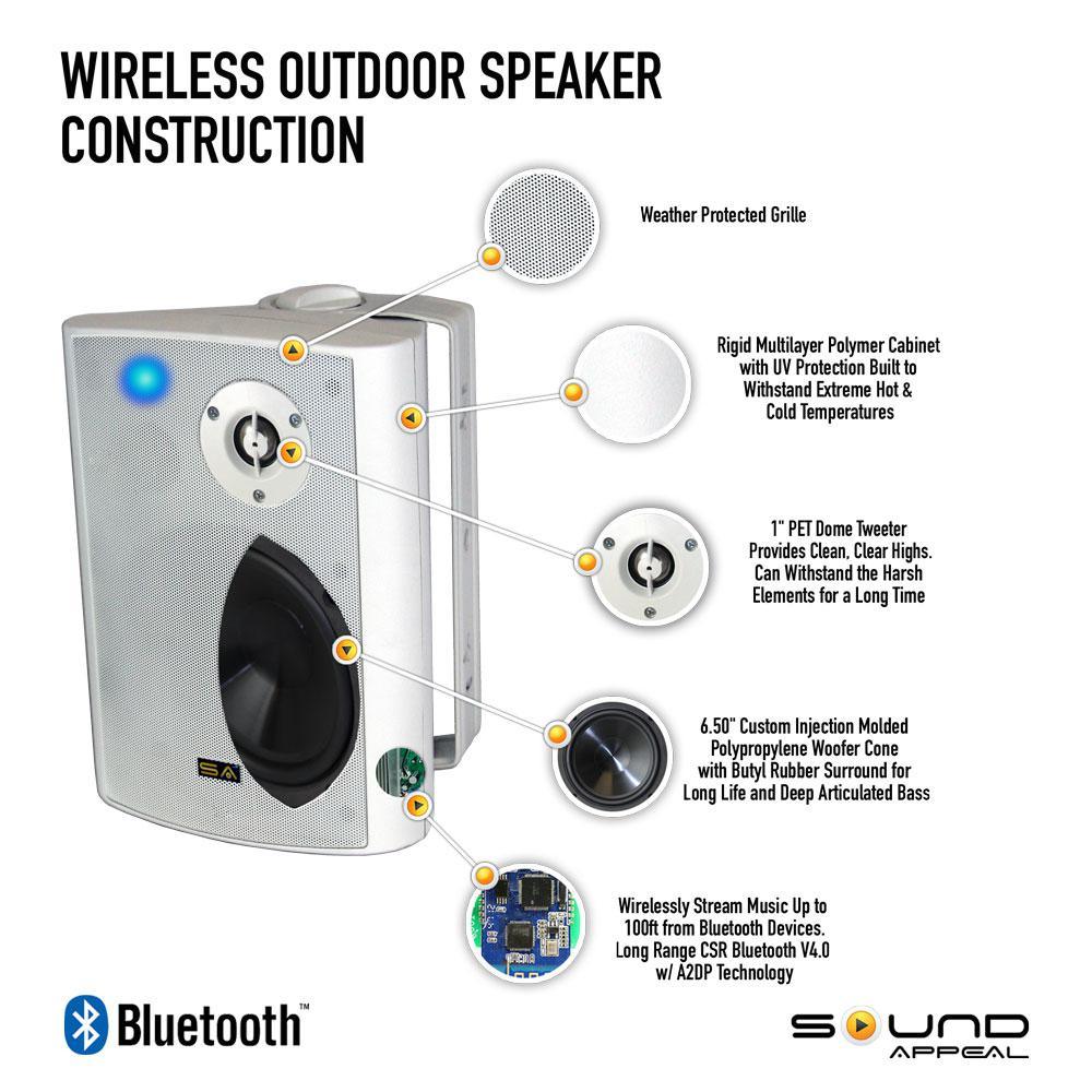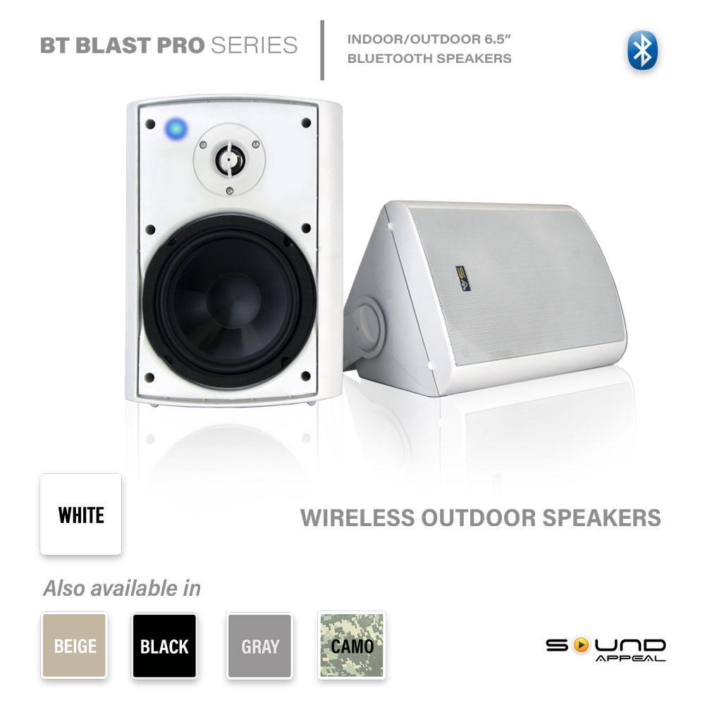 BT Blast PRO Bluetooth Indoor/Outdoor weatherproof speakers from Sound Appeal are a leap forward in technology. The BT Blast PRO will stream music up to 60 ft. away from your android, iPhone or other Bluetooth enabled device (Results may vary based on other Bluetooth and or WiFi devices in use). Ideal for your patio, garage, basement or in your living room. The weatherproof cabinet has a UV resistant white finish that will not fade and is made of durable ABS material. The internal cabinet walls are thick with rigid bracing to prevent cabinet resonance, allowing clean, clear sound at all volume levels. The new and improved 6.5 in. polypropylene woofer provides excellent bass and clear vocals and the 1 in. dome tweeter offers smooth highs with no hint of harshness; keeping vocals clear and concise. The internal amplifier is a high efficiency Class D design with 2 x 40-Watt RMS of output power. Specifications: Long Range CSR Bluetooth V4.0 with A2DP technology, 110-Volt to 220-Volt AC input, 50 to 60Hz., UV resistant White finish, Frequency Response: 45Hz to 20kHz, Power supply: Weatherproof, Color matched, 25 ft. length Speaker Wire: UV resistant, Color matched, also 25 ft. length.