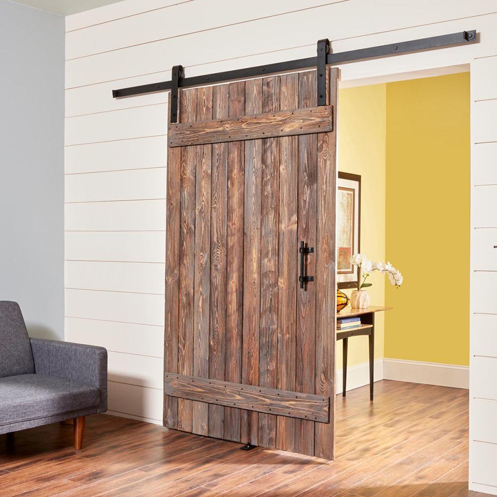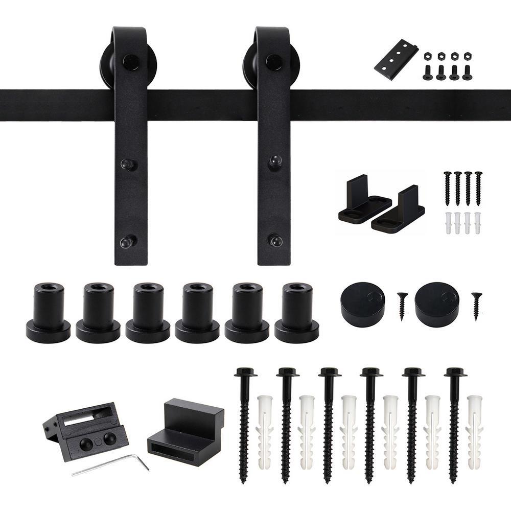 Keep your barn door rolling easily and quietly with this WINSOON 96 in. Frosted Black Sliding Barn Door Hardware Track Kit . Balanced hangers keep the weight even on the wheels for smooth operation. A precision, solid carbon steel extruded track adds durability and guarantees that the door will not jump track. High density plastic wheels provide ultra-quiet experience. Includes door stoppers to set the exact sliding range. The strong floor guide stabilizes door movement. Kit is for a single door 1-3/8 in. and 1-3/4 in. thick, up to 230 lbs. Door is not included.