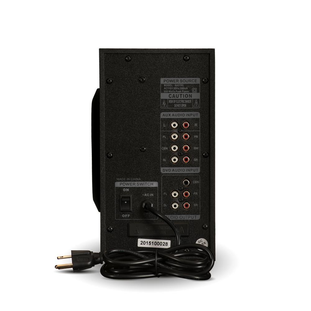 This Acoustic Audio Bluetooth 5.1 System features a contemporary design and is a stylish addition to any home. This 800-Watt, 6-piece system includes one powered subwoofer and five satellite speakers as well as cables and instructions needed to "Plug and Play" any audio source with a RCA audio output or use the front panel USB interface or SD/MMC card input. Use it for your home theater system, personal computer or laptop, gaming system, cell phone, MP3 player or any other audio devices with 3.5 mm. headphone output. The powered subwoofer features independent speaker controls as well as bass, treble and volume functions. It utilizes a digitally tuned wooden enclosure for increased bass response. The full-range satellite speakers feature magnetic shielding for use near televisions and computer monitors as well as included mounting hardware.