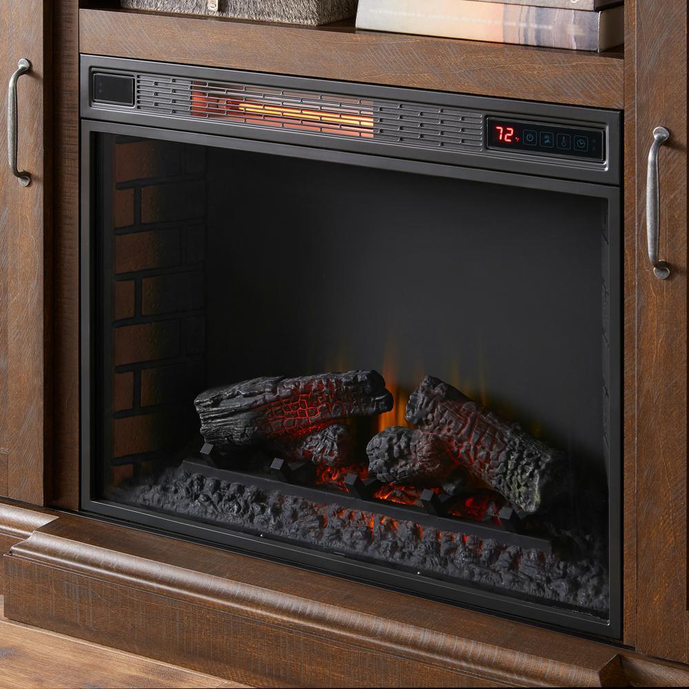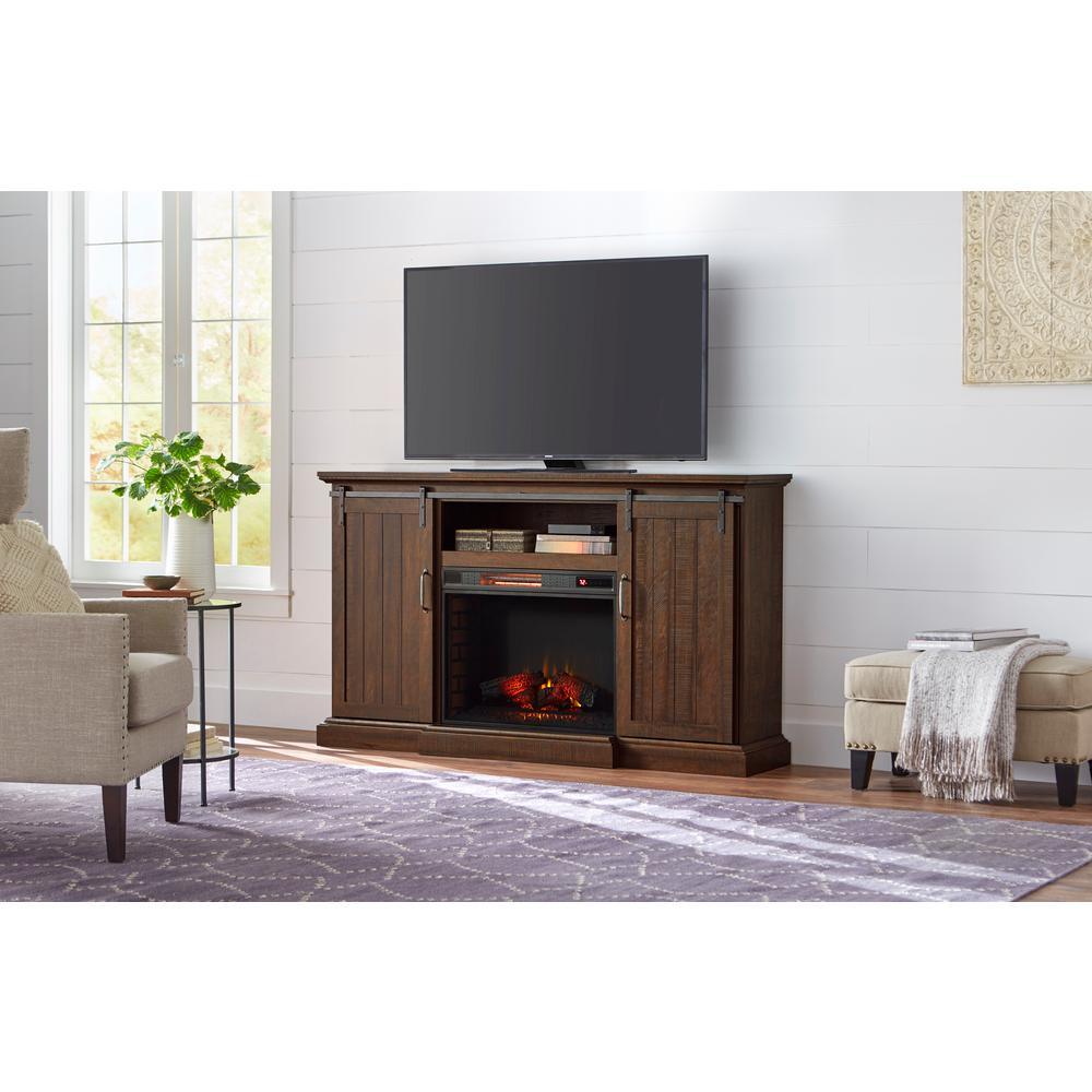 This media console TV stand with electric fireplace was designed to add ambiance and warmth to your home. Sliding doors reveal the 28 in. infrared quartz electric fireplace. Through infrared heating technology, the natural humidity in your home is maintained for comfortable heat that doesn't dry out the room's air. Providing supplemental zone heating for up to 1,000 sq. ft. and showcasing stunning flame effects, this electric fireplace is sure to create a welcoming environment. Spectrafire flame effect technology offers 3 blue and 3 amber effect options to create your ideal fire, displayed on a realistic log set and ember bed. The flame effects can be used with or without heat for year-round enjoyment. Glass front firebox stays cool to the touch for use around children and pets. Change the settings easily using the control panel on the unit or with the included remote control. The center media shelf and side cabinets include pass through holes for your media components while adjustable shelves offer customizable storage for all your entertainment accessories. This TV stand accommodates most flat screen TVs up to 80 in. or up to 155 lbs. Tip restraint hardware is included to help prevent accidents and damage.