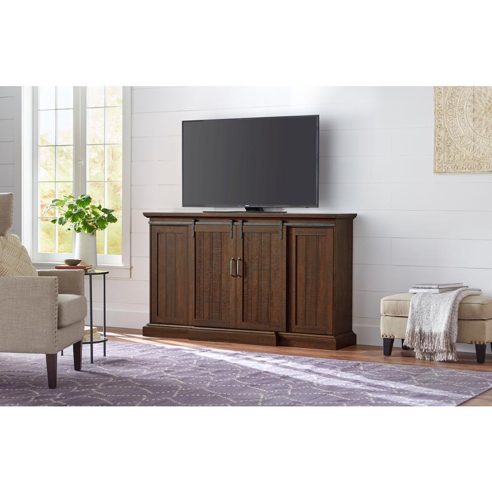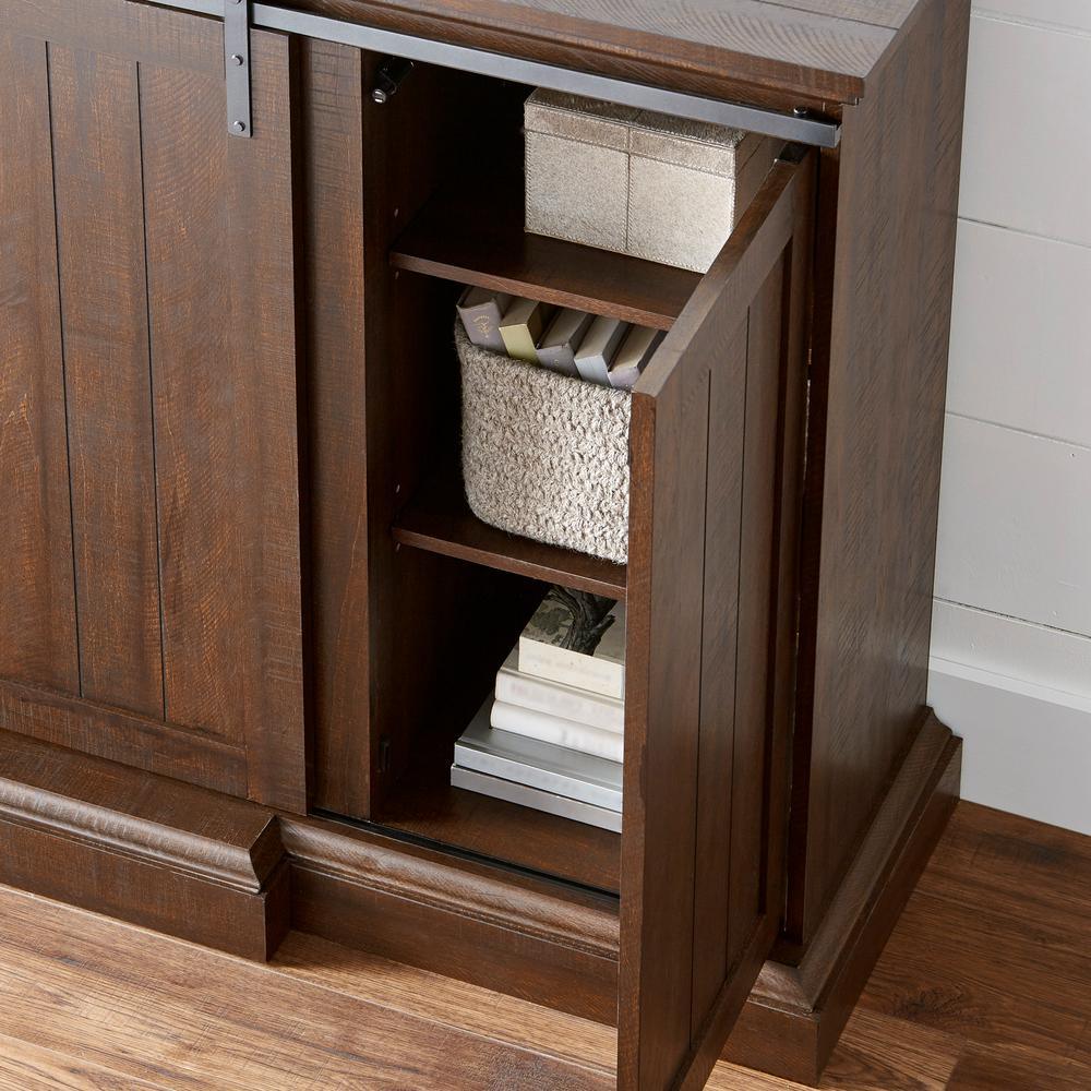 • Design features planked top and real sliding barn doors in rustic walnut finish with pewter handles