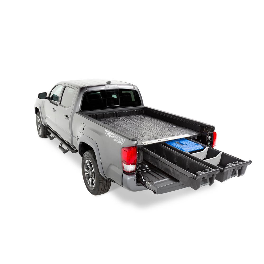 DECKED revolutionized Pickup Truck Bed Storage with a low-profile truck bed tool box system that is compatible with Ford, Dodge RAM, Chevy, GMC, Nissan and Toyota midsize trucks. 2 full bed-length drawers offer dry, secure storage with ergonomic access for tools, gear, guns, fishing rods and other items that slide out at waist height, while still allowing the owner full use of their truck or van bed. DECKED has a 2,000 lb. payload on the deck and 200 lbs. per drawer load capacity. Covered by 3-year warranty against product defects or failure due to workmanship. Further organization and customization is possible with optional nesting storage boxes, drawer dividers, tie downs and locks. DECKED Storage Systems are easy to install or remove, weatherproof, secure, and ergonomic. With a low-profile design the DECKED Storage System leaves plenty of room for further upfitting. DECKED Truck Storage Systems are perfect for small businesses like painters, carpenters, plumbers and handyman services. DECKED Storage Systems were also designed with the outdoors enthusiast in mind, allowing you to carry fishing, hunting or any kind of sports gear you can imagine. Note: drawers are not water or airtight, some fine particulate matter such as dust and water vapor may enter. Assembly and installation time approximately 2 hours. Removal/reinstall time approximately 15-20 minutes.