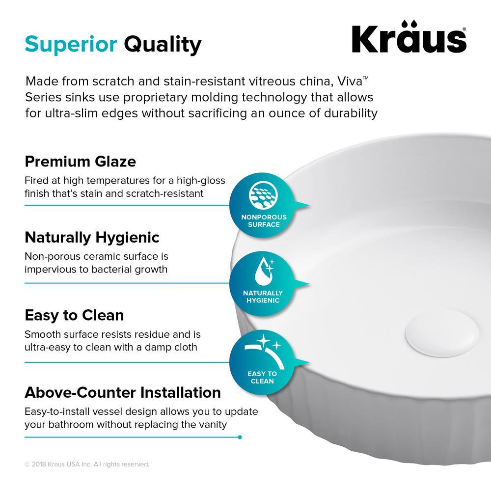 An essential collection of light and simple shapes with minimalist design elements, the Viva Series features sinks made from high-tech vitreous china using a proprietary molding process that allows for ultra-slim edges without sacrificing an ounce of durability. Slender silhouettes and textured exteriors create a light and airy look thats refreshingly modern and perfect for any size of bathroom. The naturally hygienic non-porous ceramic surface is impervious to bacterial growth, and is fired at high temperatures for a high-gloss finish thats scratch and stain-resistant. Easy above counter installation allows you to update your bathroom sink without replacing the entire vanity. Available in a selection of on-trend colors to complement any decor, from classic white to subtle neutrals to bold modern black.