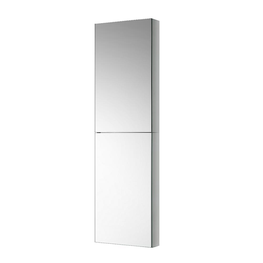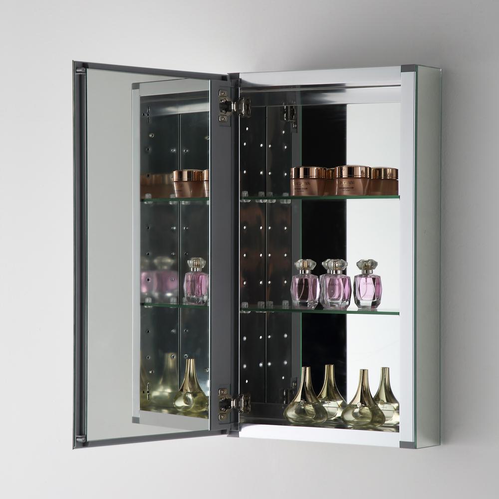 Every in. of this tall Fresca 15 Wide Bathroom Medicine Cabinet is mirrored inside and out to reflect light and give your bathroom a fresh and modern feel. Two doors feature mirrors on both sides, allowing you to keep an eye on your appearance while accessing daily necessities from within the cabinet. The interior back wall of the cabinet is also mirrored and has four adjustable tempered glass shelves that can accommodate items of varying heights. An anodized aluminum frame creates a moisture and dust resistant interior.