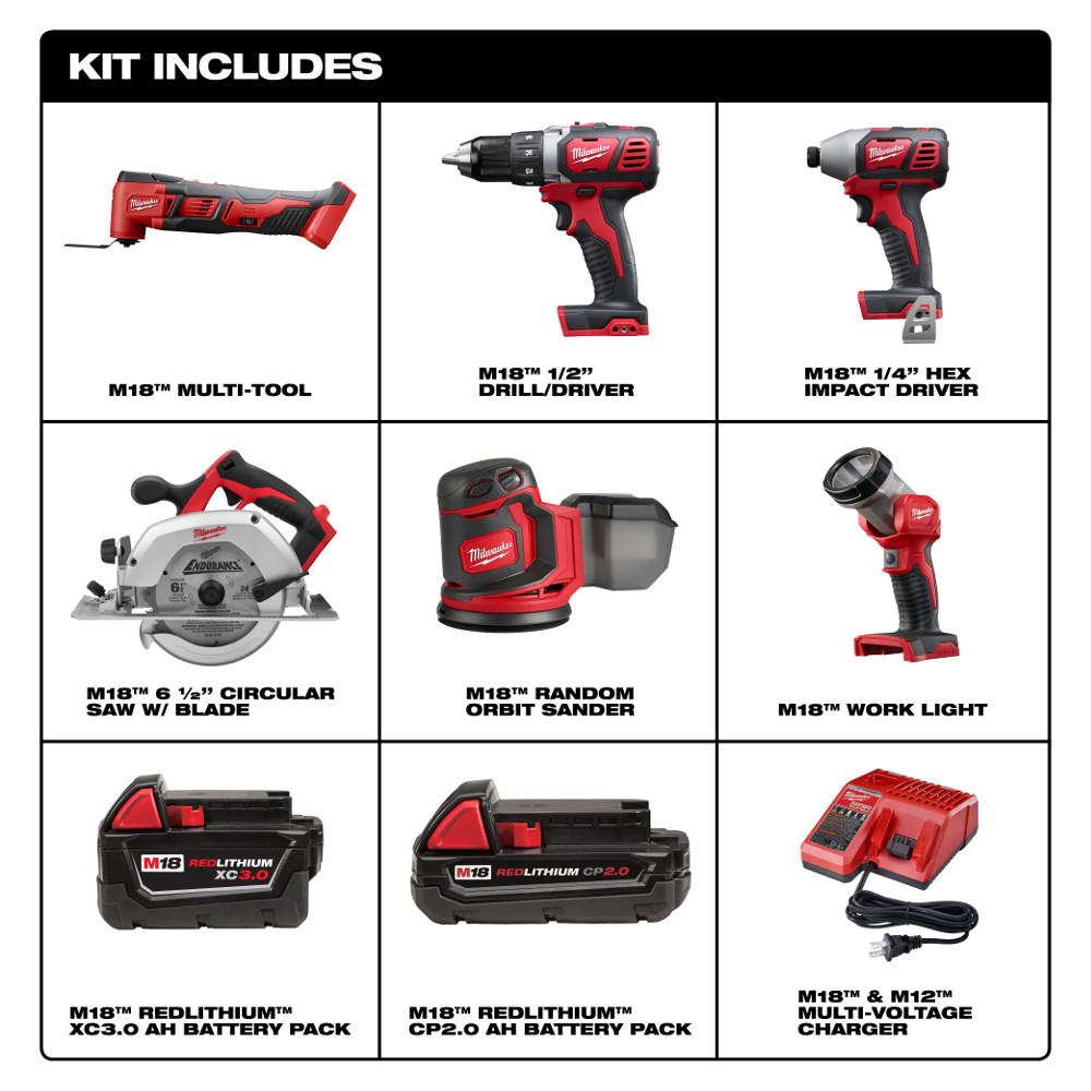 • Includes: one M18 multi-tool bare (2626-20), one M18 1/2 in. drill driver (2606-20), one M18 1/4 in. hex impact driver (2656-20), one M18 6-1/2 in. circ saw tool-only (2630-20), one M18 random orbit sander (2648-20), one M18 LED flashlight (2735-20), one M18 3.0AH XC high cap lithium-ion battery (48-11-1828), one M18 compact 2.0 lithium-ion battery (48-11-1820 ), one M12-M18 multi-Voltage charger (48-59-1812), tool bag