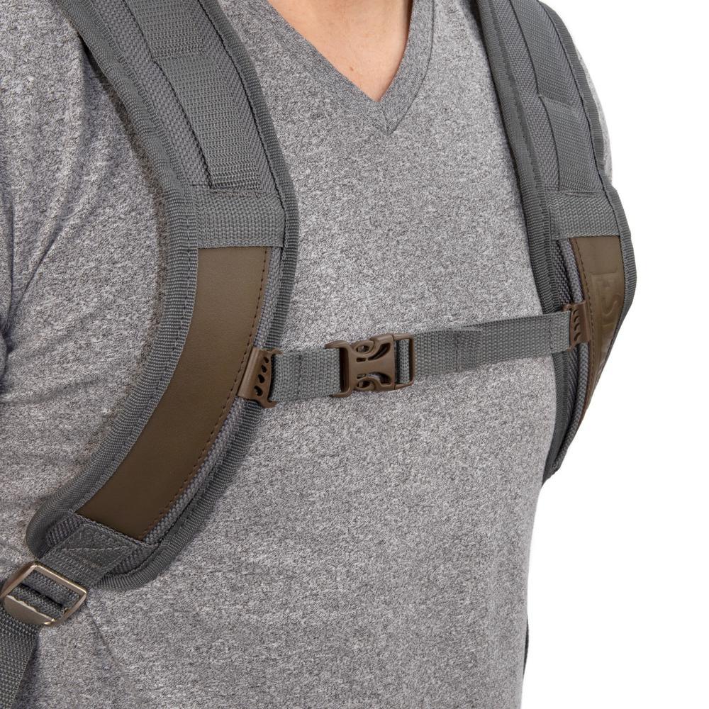 Designed and constructed for maximum utility and ultimate reliability, this 20 in. Estwing tool pack combines top grain cowhide leather and 1800 D polyester to provide easily portable and heavy-duty tool organization and storage. The ergonomically shaped straps along with the back lining are padded with cooling mesh that allows them to remain breathable during wear and in hot conditions. A length and height adjustable chest strap keeps the bag secure and in a comfortable position for long duration wear. The outside of the pack has a number of pockets and pouches including a pass through pocket that gives you direct access to the main storage compartment without having to completely open the bag. A padded laptop pocket gives you a secure place to store and protect expensive items. The inside of the backpack has a large number of loops and pockets to store and organize tools. The bottom of the bag features a hard plastic boot that provides a stable base when the bag is set down as well as added durability and moisture resistance.