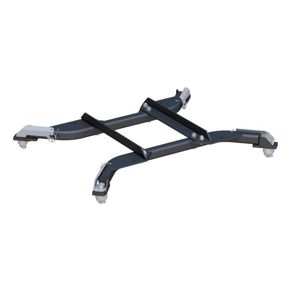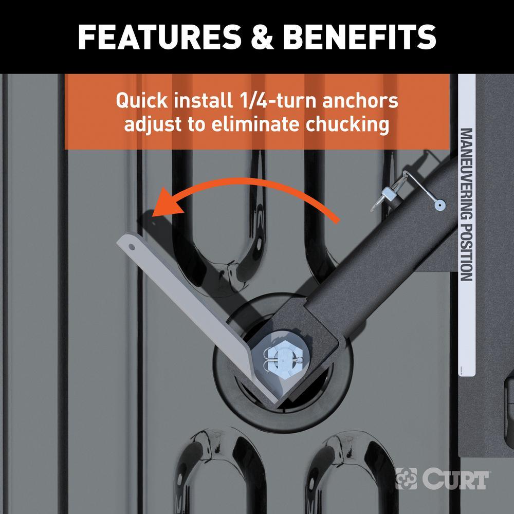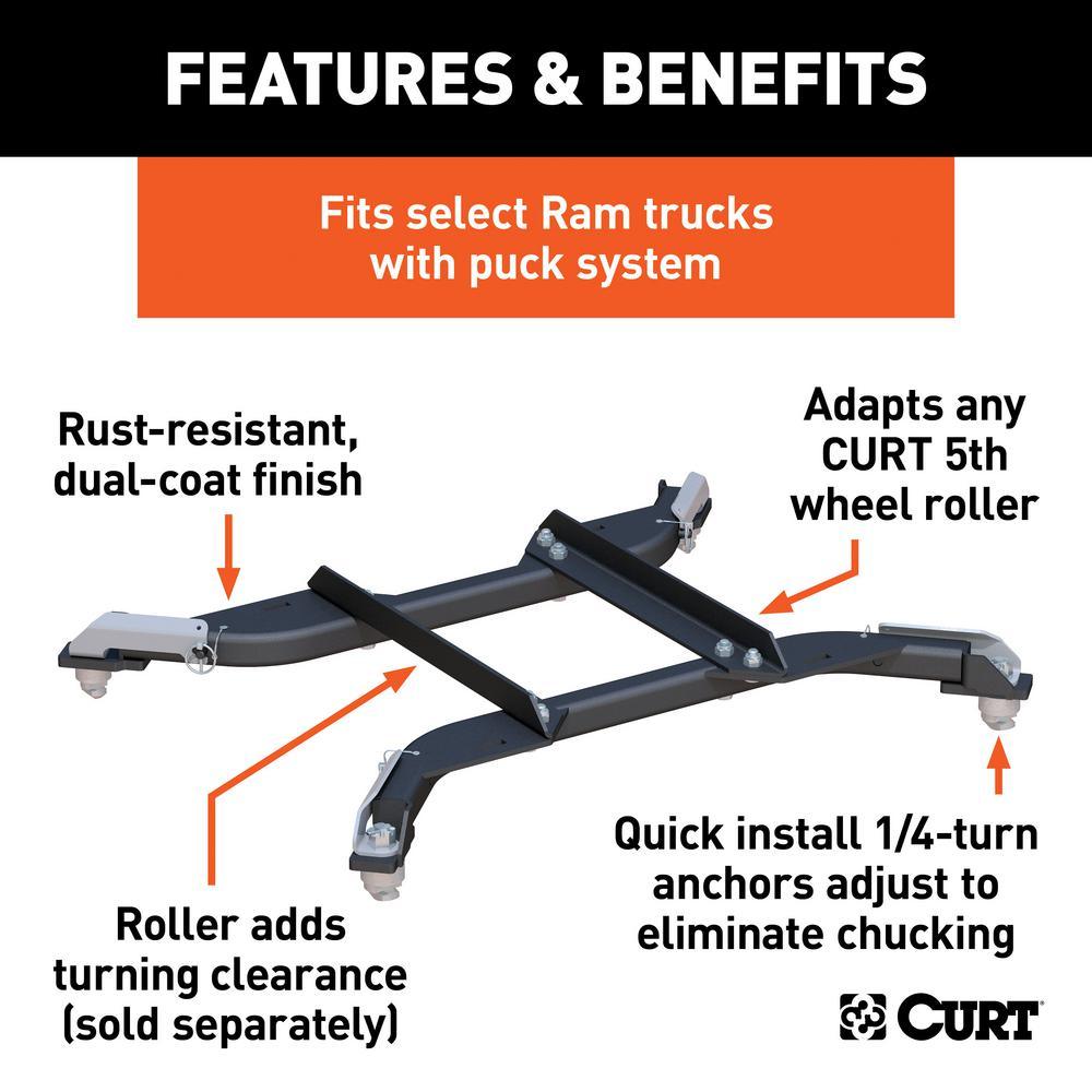 The CURT OEM puck system 5th wheel roller adapter for Ram pickups combines the functionality of a CURT 5th wheel roller with the strength and convenience of Ram's truck bed puck system. The adapter is designed to securely mount a CURT 5th wheel roller and hitch head into the bed of your Ram truck, using the OEM puck system. It features a set of adjustable, quarter-turn anchors to quickly and easily drop into the pucks and provide a moveable platform for the 5th wheel coupling point.