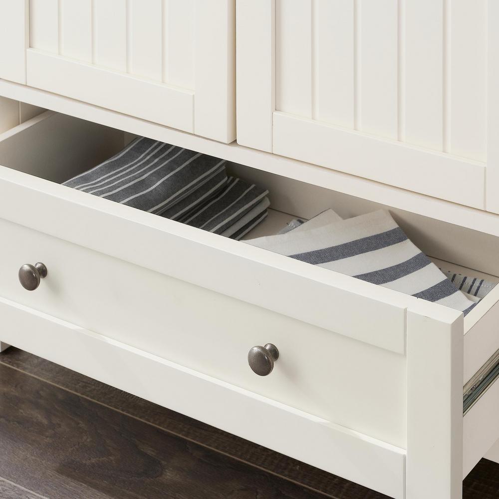 Our farmhouse-inspired StyleWell Bainport pantry creates storage anywhere it's needed. The freestanding design is fitted with rustic beadboard doors and a spacious lower drawer. Two interior shelves adjust as needed to accommodate dry goods, craft supplies and other everyday essentials. Finished in classic ivory, it's a standout addition to any dining, cooking, working and living area.