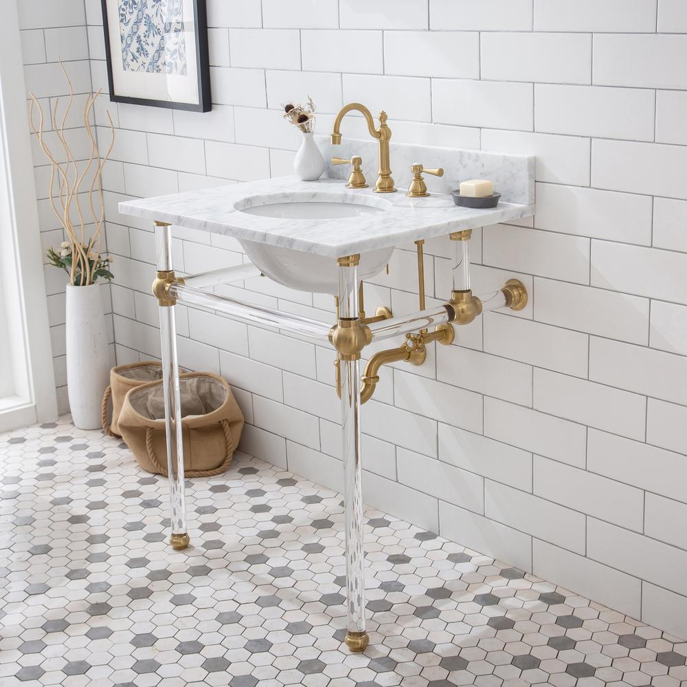 A classically inspired washbasin console, Empire Collection, enhances contemporary beautification into a sophisticated bathroom. Solid brass joints and acrylic stand melding for a cohesive whole, this Carrara white marble console sink with crystal clear acrylic stand is a perfect match for a miniature bathroom. An accessible bar across the front of deluxe, substantial acrylic legs not only improves stability but also provides a location from which is perfect for hanging towels and toiletries. Suitable for applications both contemporary and traditional, this artful design retains the harmony between proportions and its timeless charisma.