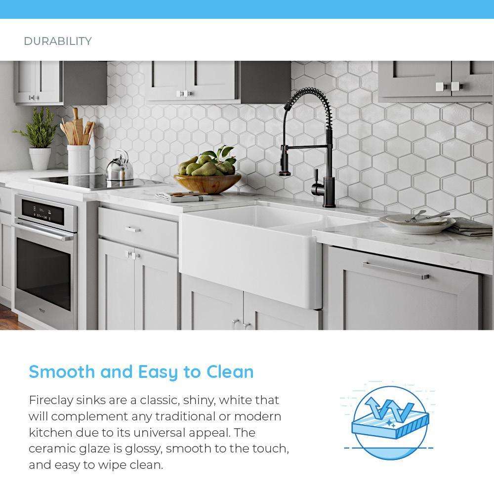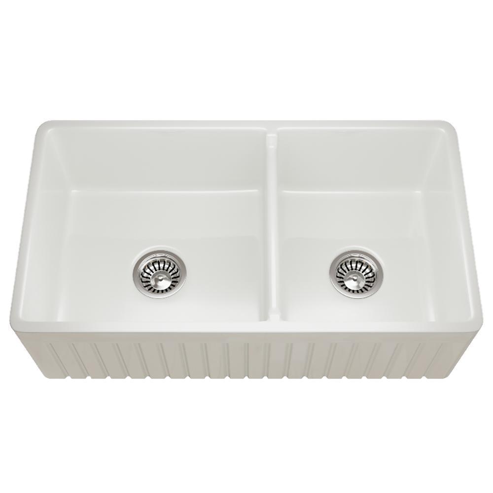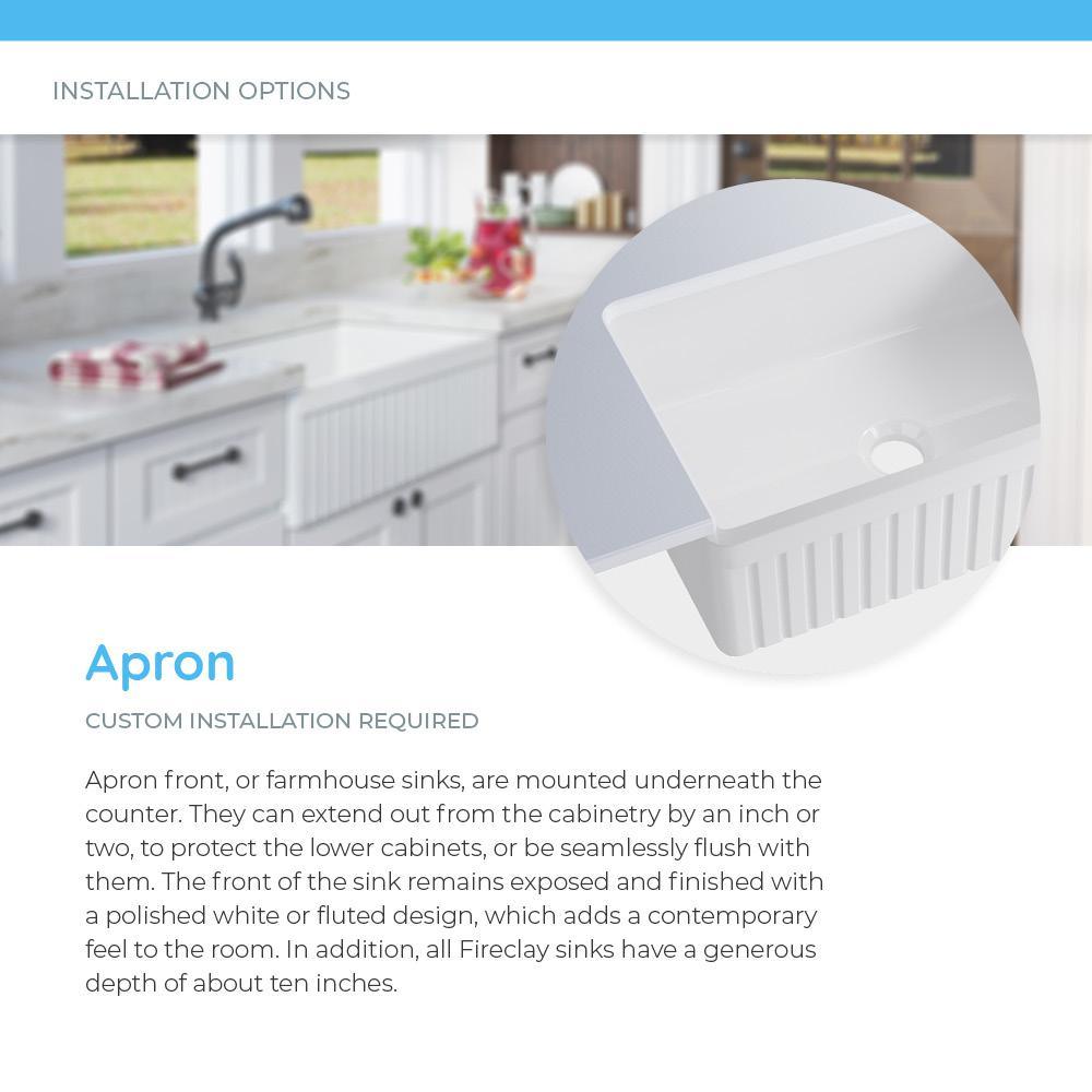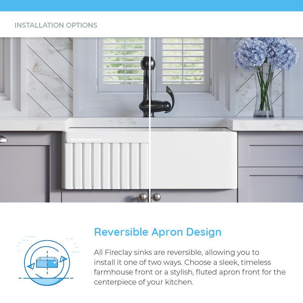 Initially created with the functionality of a farmhouse sink, the 413 Fireclay Double Offset Bowl Sink has a twist of extra convenience in the form of its second basin. The 413 Fireclay is fired at extremely high temperatures (about 2,000°Fahrenheit) to ensure a smooth body, a durable base, and an overall beautiful result. The Fireclay Double Offset Bowl has overall dimensions of 33 in. x 18 in. x 10 (note that a single bowl Fireclay is also available in this exact size). Fireclay is made with durability in mind, and it is incredibly chip, crack, and stain resistant; it is sure to bring both fashion and function to your kitchen. As an added bonus, the Fireclay is rust-proof, heat resistant, and reversible, offering a simple fluted design on one side and a smooth side on the other. This listing does not include any accessories.