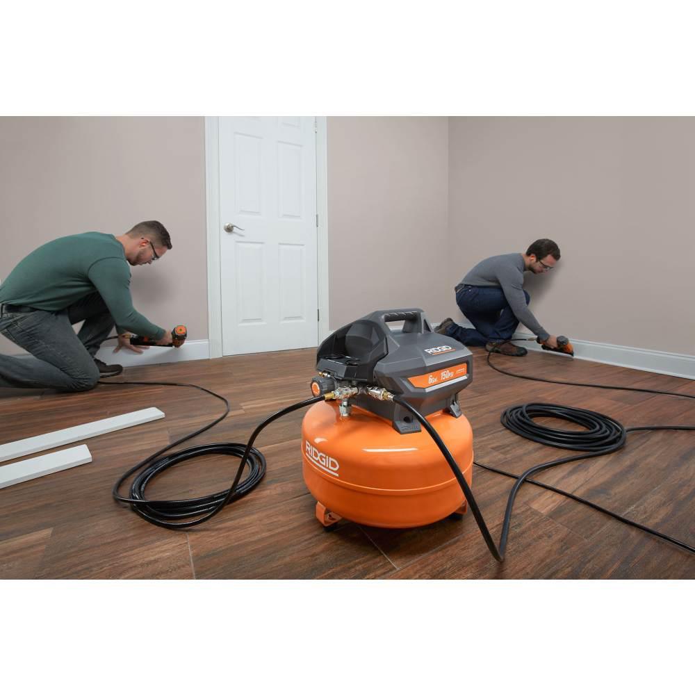 RIDGID introduces the 6 Gal. Portable Electric Pancake Air Compressor with 1/4 in. 50 ft. Lay Flat Air Hose. This powerful compressor is perfect for trim and finish work with 150 PSI. Work with multiple people on the jobsite with dual universal quick connectors and use 2 nailers at once. Equipped with a Best-in-Class oil-free pump for reliable, maintenance-free performance, this compressor has everything you need to get the job done. Backed by the RIDGID 3-Year Manufacturer's Warranty, this compressor includes an electric cord and an operator's manual. The RIDGID Lay Flat Hose has a unique lay flat design that allows it to keep its shape, is kink resistant, is non-tangling. At just over 3 lbs. for a 50 ft. hose, its lightweight design makes it easier for you to maneuver around your work space. Heavy-duty 360° swivel fittings with bend restrictors make the usual weakest point on of this hoses strengths. The durability of the bend restrictors provides extra-support to increase the life of the hose. Unlike other hoses, the Lay Flat hose is able to flex in cold weather, which allows you to keep working regardless of your climate. It's 100% field repairable which saves you time and money in case of an accidental tear. With a 300 maximum PSI capacity, the RIDGID Lay flat Hose can be used for heavy-duty applications. The 1/4 in. 50 ft. Lay Flat Air Hose is warranted against defective parts and labor, and includes 360° swivel fittings.
