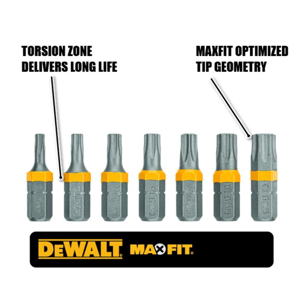 DEWALT MAXFIT screw driving bits are engineered for use with Impact Drivers. Their tip geometry reduces wear and creates an ideal fit with every fastener. Each bit features a unique torsion zone to deliver long life in both metal and wood fastening applications. The S2 modified steel enhances the overall durability of the product. CNC manufacturing ensures the product consistently delivers the highest level of quality.
