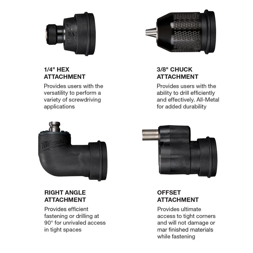 - 1/4 in. hex, 3/8 in. chuck and offset attachments connect to right angle attachment for added versatility when drilling and fastening at a right angle