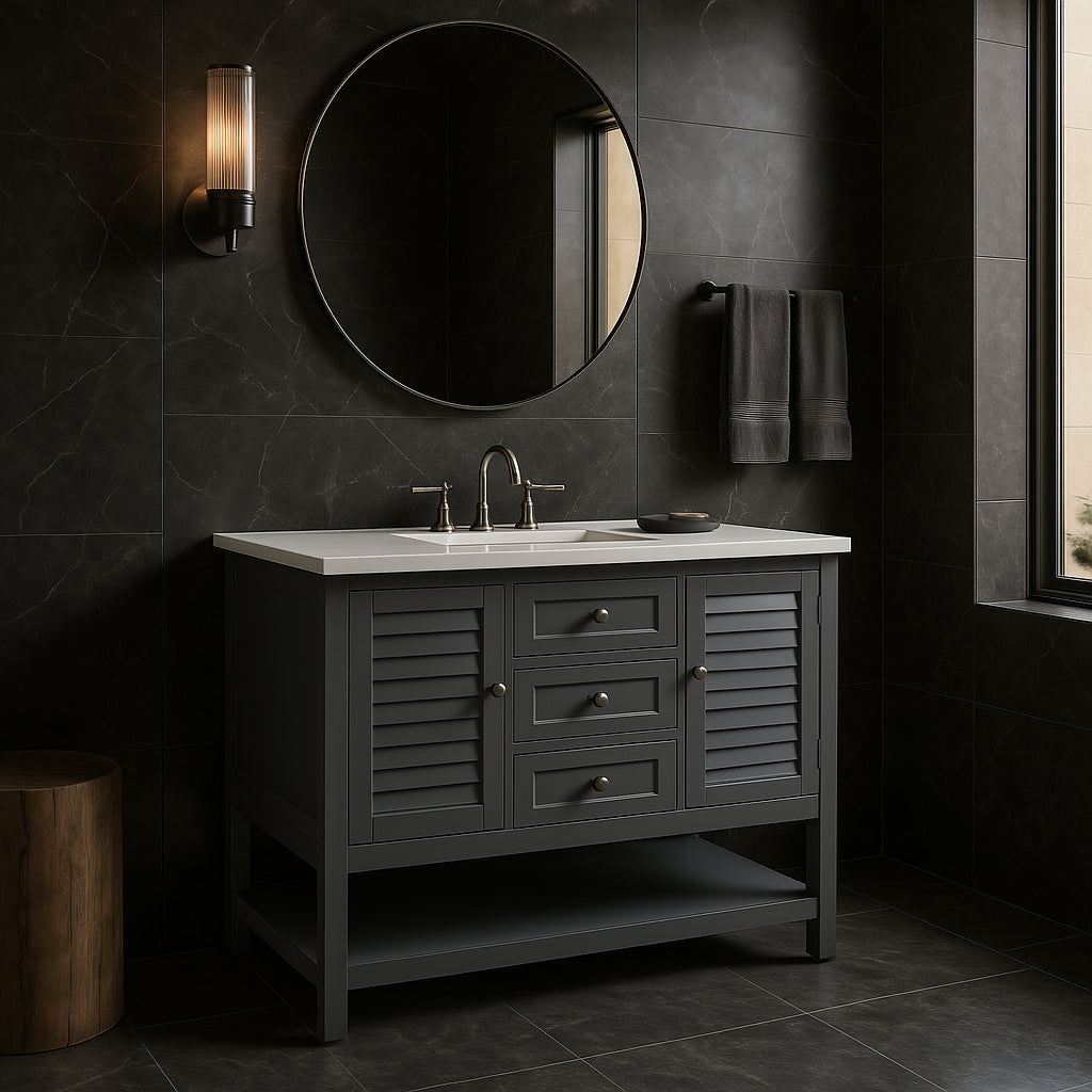 The Grace 48-inch bathroom vanity combines coastal chic design with practical storage solutions. Featuring a pebble gray finish, engineered stone countertop, and soft-close features, it offers both style and functionality.