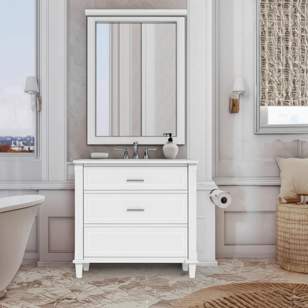 The Pinestream 36-inch bathroom vanity combines elegant design with practical features, including a durable marble countertop, soft-close drawers, and brushed nickel hardware. Perfect for enhancing any bathroom space.