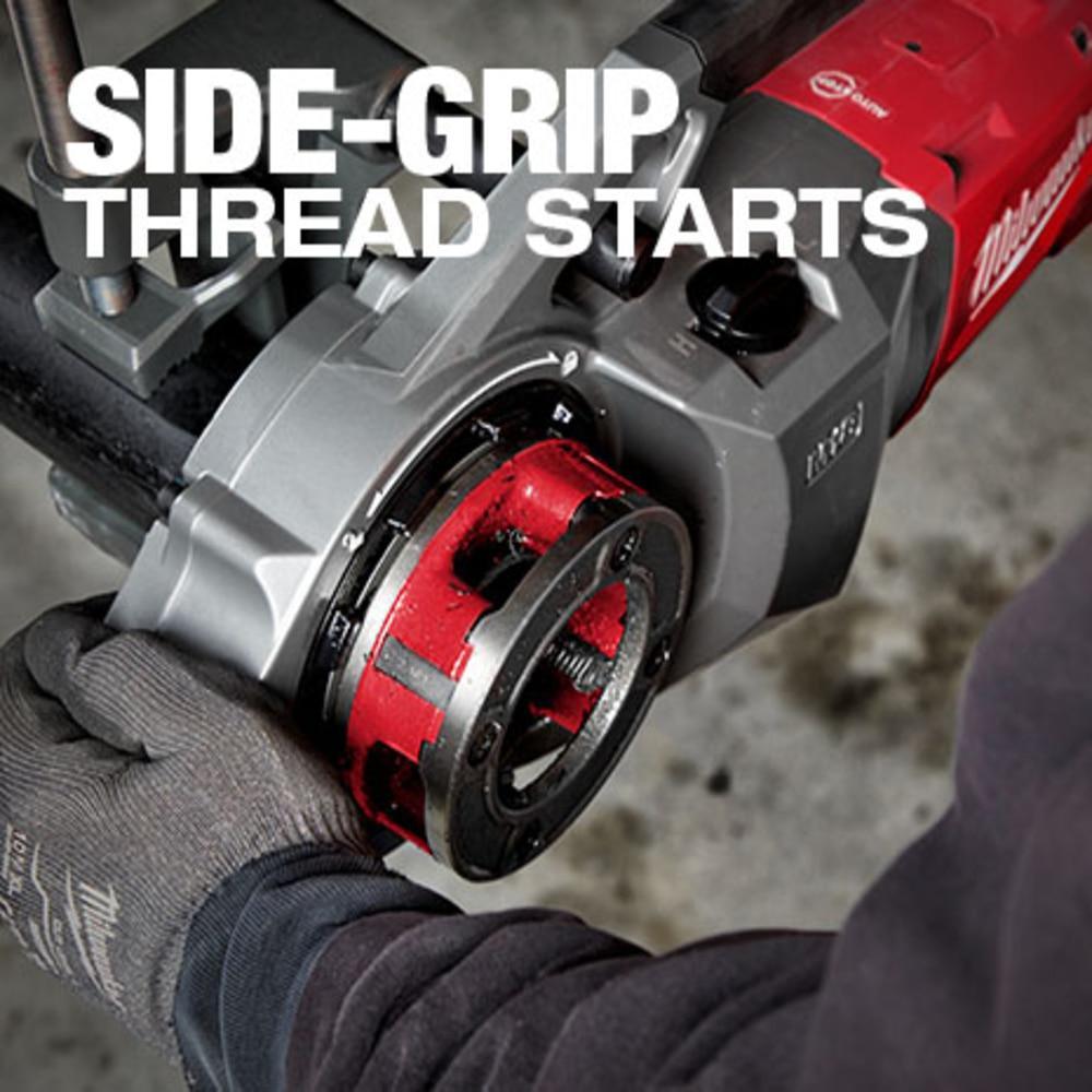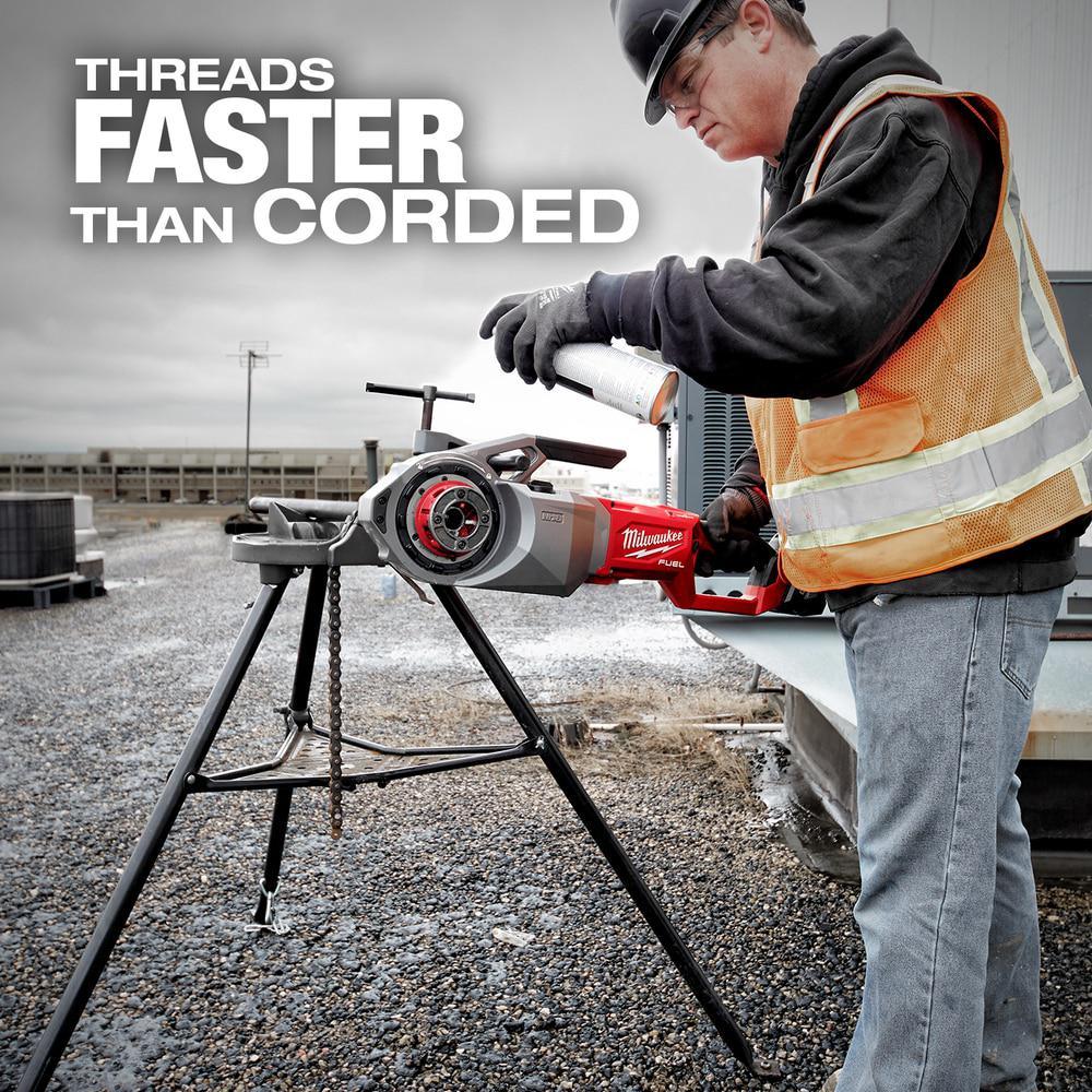 M18 fuel cordless brushless pipe threader with 1-key is the industry's first cordless pipe threader, revolutionizing the pipe threading process. The cordless pipe threader features auto stop technology that senses severe kickback and automatically shuts the tool off. It also has a die head lock preventing die head ejection and a side handle to eliminate the need for you to hold the spinning die head when starting threads. The portable pipe threader delivers unmatched tool control and functionality and allows you to thread faster than the corded competition. Featuring a multi-speed selector, this powerful pipe threader threads faster than corded competitors, maximizing your productivity without compromising thread quality. Our M18 red lithium high output HD12.0 battery delivers unmatched run-time in all applications and gives you the power to thread up to 2 in. black iron pipe, stainless steel and rigid metal conduit (RMC). The handheld pipe threader is compatible with 1-key technology and is the industry's first pipe threader that wirelessly connects to a smartphone to track the tool's location, manage it in inventory and lock the tool out for added security and protection to your investment. In addition to the threader, the kit includes 2-M18 high output HD12.0 battery packs, an M18/M12 rapid charger, a threading support arm and a carrying case.