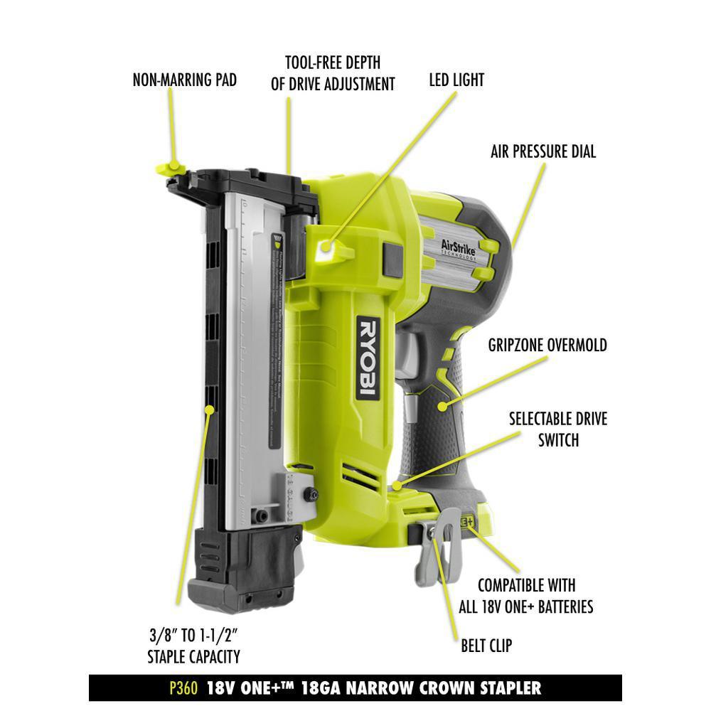 RYOBI introduces the 18-Volt ONE+ Airstrike 16-Gauge Straight Finish Nailer and 18-Gauge Narrow Crown Stapler with Lithium-ion Battery and Charger Kit. The AirStrike 16-Gauge Straight Finish Nailer features AirStrike Technology, which eliminates the need for noisy compressors, bulky hoses, or expensive gas cartridges. This means faster setup and easier maneuvering on the job site. The AirStrike Straight Finish Nailer drives 16-Gauge nails from 3/4 in. to 2-1/2 in. l. The 18-Volt ONE+ AirStrike 18-Gauge Cordless Narrow Crown Stapler also features AirStrike Technology, and drives 3/8 in. to 1-1/2 in. narrow crown staples. The battery in this kit features lithium-ion battery cells, providing the user with up to 1.5X more runtime compared to Ni-Cd counterparts. The 18-Volt ONE+ Dual Chemistry IntelliPort Charger is compatible with all RYOBI ONE+ lithium-ion batteries and features IntelliPort Technology to maximize the lifetime of your RYOBI batteries. Best of all, this kit is part of the RYOBI ONE+ System of over 175 cordless tools that all work on the same battery platform. Backed by the RYOBI 3-year manufacturers warranty, this kit includes an AirStrike 16-Gauge Straight Finish Nailer with belt clip and sample nails, the 18-Volt ONE+ AirStrike 18-Gauge Narrow Crown Stapler with belt clip and sample staples, a 2.0 Ah Compact Lithium-ion Battery, a Dual Chemistry IntelliPort Charger, and an operator's manual.