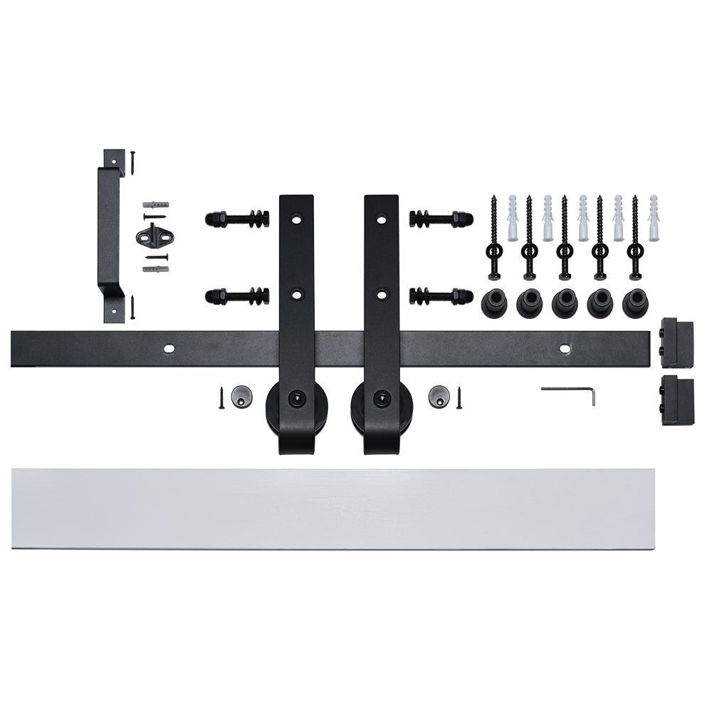 • Kit includes solid wood door with laminate face with 78-3/4 in. primed wood mounting board, matte black handle and rail hardware assembly required