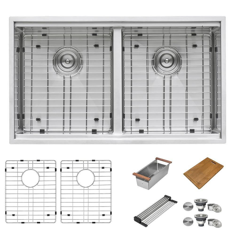 Ruvati is one of the premier names in kitchen sinks. With manufacturing and distribution facilities in US, Europe and Asia, the Ruvati name is synonymous with exceptional quality products. This Ruvati Workstation sink from the Urbana series is more than just a sink. It features built-in accessories that slide on the integrated tracks. Includes a deep stainless steel colander that you can use as strainer. The solid cutting board is constructed of Sapele wood - a luxurious hardwood that handles water well. The foldable rack fits on the top track and is ideal as a dish drying rack. It is constructed of stainless steel bars and a flexible silicone frame allowing you to fold it up tightly for storage. The sink is constructed from 16 gauge steel, one of the thickest available for residential kitchens. Ruvati uses T-304 grade stainless steel with a 18:10 Nickel:Chromium content ensuring that your sink is completely resistant to rusting. Ruvati's unique 10mm tight radius inside corners offer a slightly curved corner for easy cleaning while at the same time retaining the resolutely modern look. Thick heavy-duty soundguard coating and thick rubber padding on the outside of the sink bowl on all sides provide sound insulation against noise and thermal insulation against condensation. The inside of the sink is finished in commercial grade brushed finish which adds to the beauty of the sink. The slanted bottom of the sink and the drain grooves channel water towards the drain.