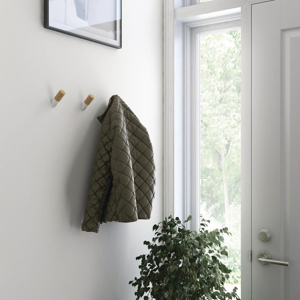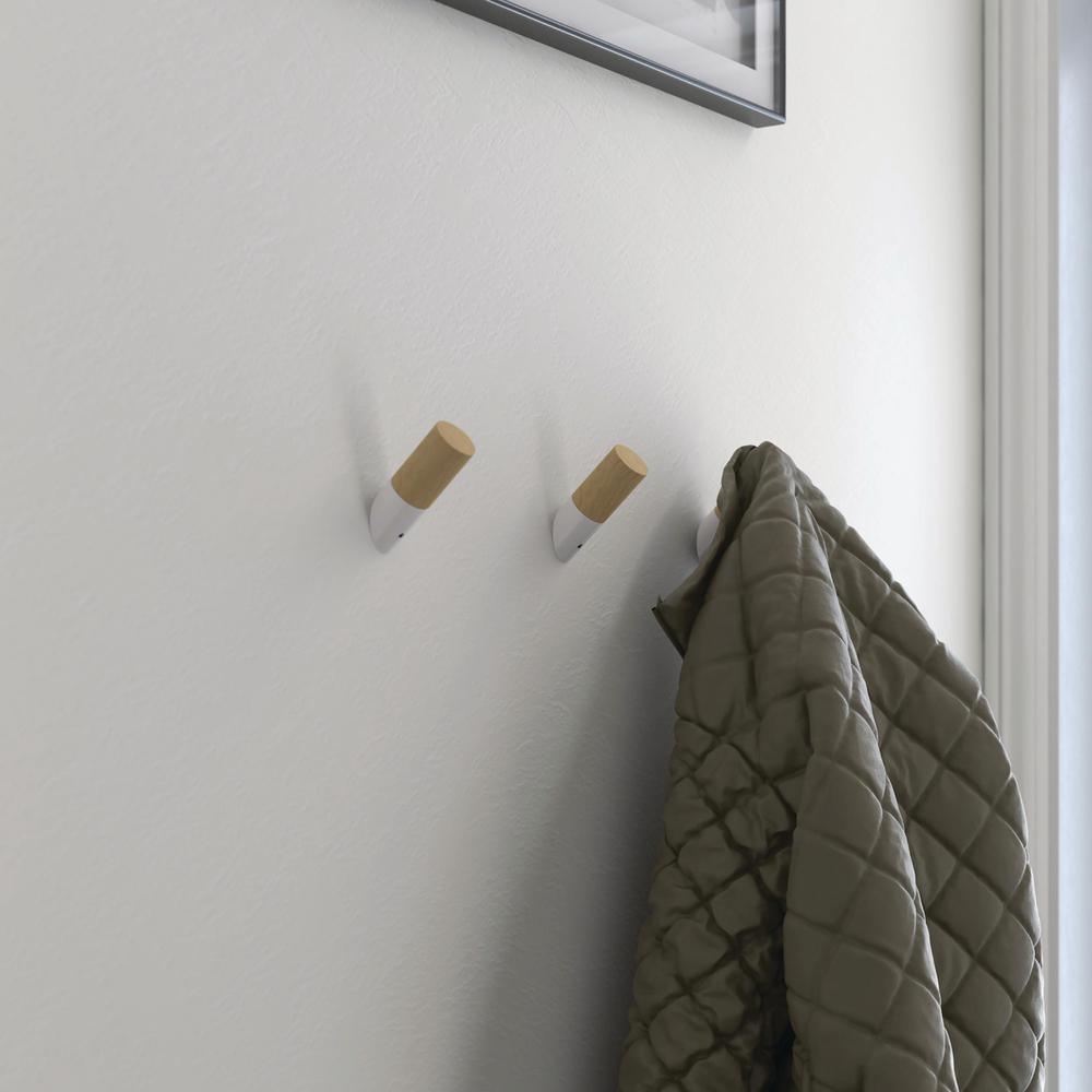 • This bright white and natural pine hook adds a modern flair to your storage needs