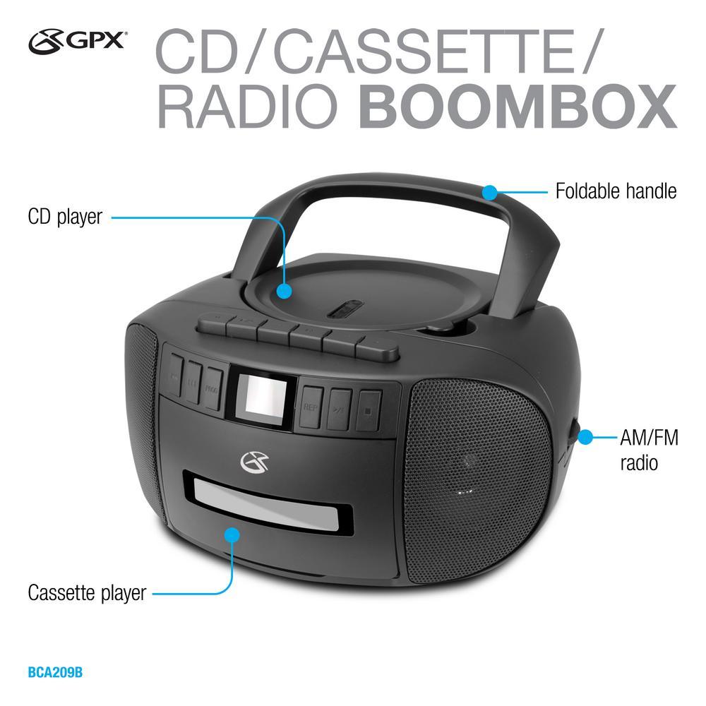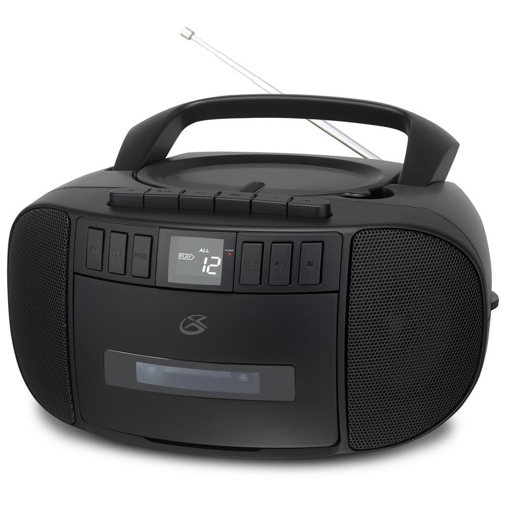 Bring the good old days into the 21st century with this classic boombox with a modern look. This boombox lets you listen through built-in speakers to radio (AM/FM), CD, Cassette or aux in. The simplistic design makes it easy for all ages to use and enjoy with Programmable Tracks and Repeat One or All Play and even records radio or CD to cassette. Plug it in at home or take your music on-the-go with the built-in AC power cable or DC batteries (6C, not included) and use the telescopic antenna to get the best reception.