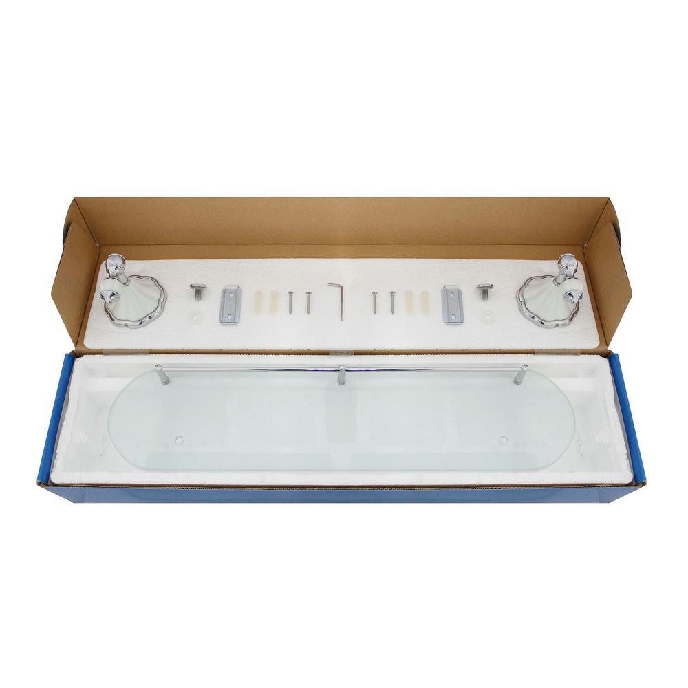 MODONA's 20 in. Frosted Glass Shelf with Rail will help you transform your bathroom into the bathroom of your dreams. Tempered Glass. Includes heavy-duty hardware, including stainless steel screws, high-quality wall anchors, detailed installation instructions and installation template. Base and finish match all other units in this series; please search Flora series to see all the other matching items, including: Double Robe Hook, Toilet Paper Holder, Porcelain Soap Dish, Porcelain, Towel Ring, C Towel Ring, 24 in. Towel Bar, 24 in. Double Towel Bar and 20 in. Frosted Glass Shelf. All of MODONA products are covered by our comprehensive 5-year warranty.