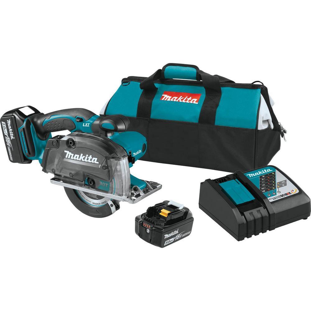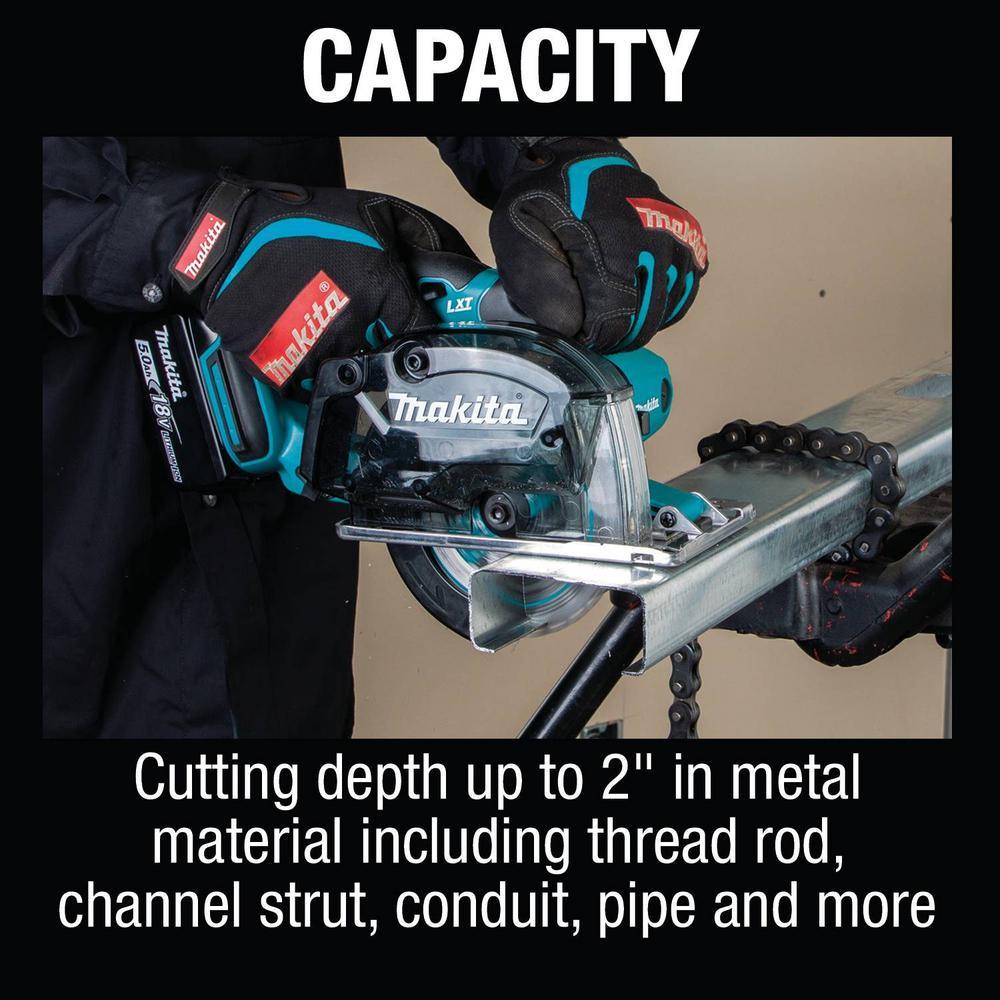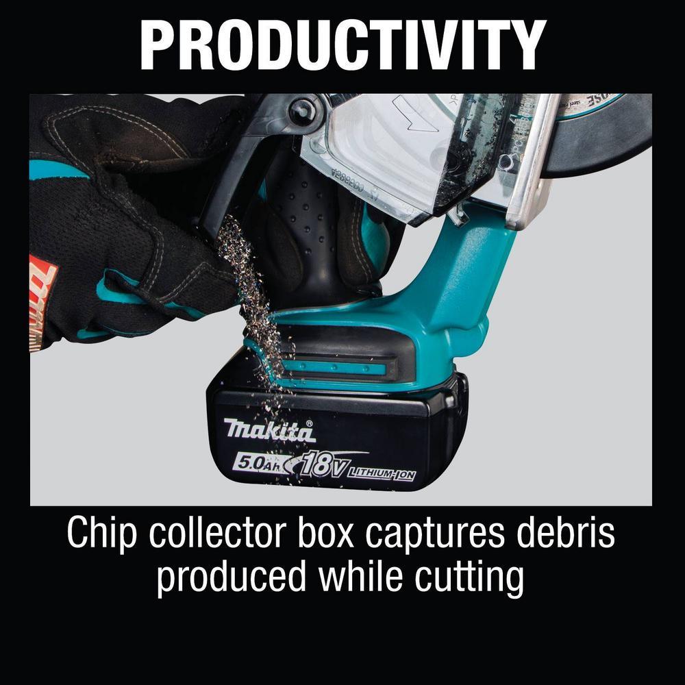 Makita is the leader in brushless motor technology and the 18-Volt LXT Lithium-Ion Cordless 5-3/8 in. Metal Cutting Saw (model XSC03T) delivers faster metal cutting through Unistrut, all thread, channel, conduit, pipe, sheet metal, square tubing, steel and more. With a maximum 2 in. cutting capacity, it is ideal for electrical contractors since it will cut 2 conduit in 1 pass a huge time saver. It is also ideal for HVAC, installation, metal building, metal fabrication, plumbing, metal roofing and for any pro-contractor who requires a best-in-class cordless metal cutting saw. The kit includes 2 fast-charging 18-Volt Lithium-Ion 5.0 Ah batteries and a Rapid Optimum Charger. The XSC03T features a transparent chip collector box which captures debris produced while cutting and provides needed visibility in determining need for disposal. Added features include a trigger switch with 2 stage lock-off requiring 2 actions to power the saw and an electric brake allowing the tool to be repositioned for maximum productivity. Makita offers 4 optimum 5-3/8 in. blade options for use with the XSC03Z: 30T carbide tipped for metal and general purpose, 50T for thin metal, 50T for aluminum, and 56T for stainless steel (all sold separately). Its part of Makita's expanding 18-Volt Lithium-Ion system, the worlds largest cordless tool system powered by 18-Volt Lithium-Ion slide-style batteries.