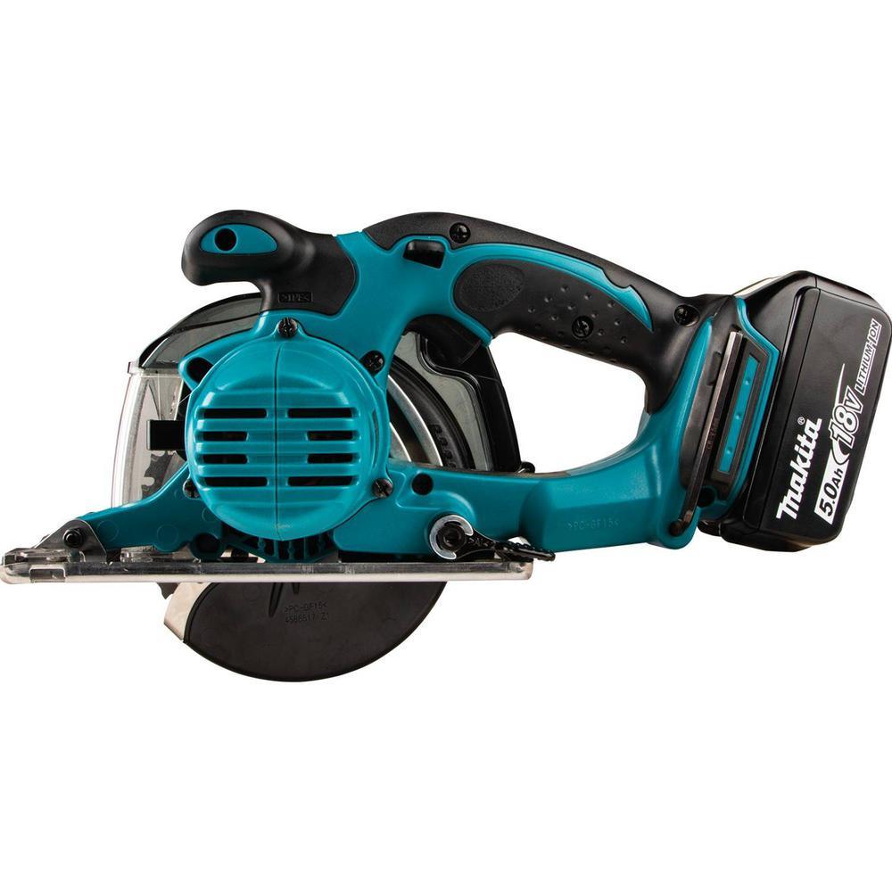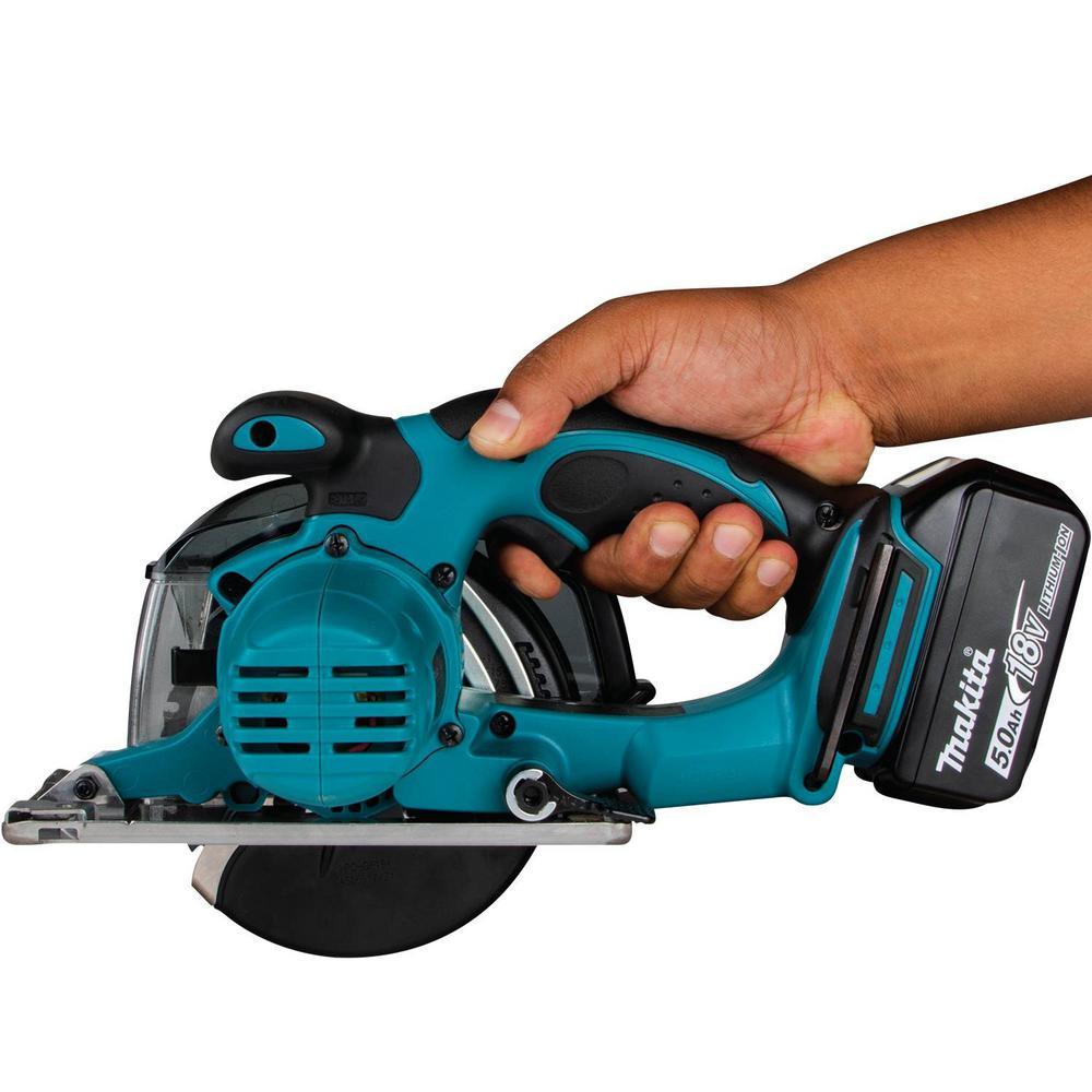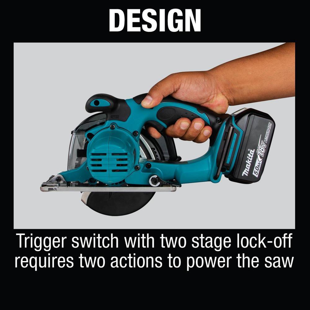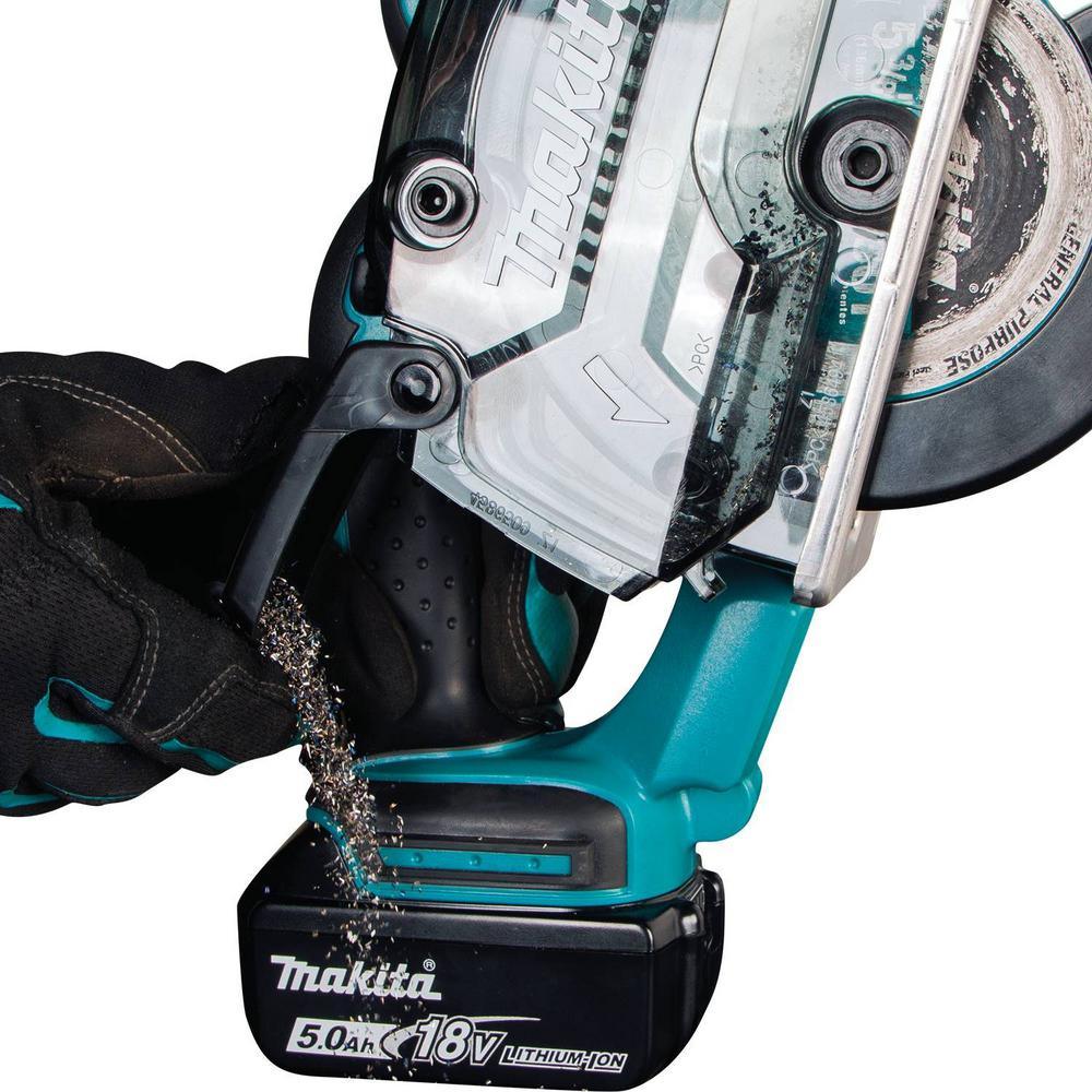 Makita is the leader in brushless motor technology and the 18-Volt LXT Lithium-Ion Cordless 5-3/8 in. Metal Cutting Saw (model XSC03T) delivers faster metal cutting through Unistrut, all thread, channel, conduit, pipe, sheet metal, square tubing, steel and more. With a maximum 2 in. cutting capacity, it is ideal for electrical contractors since it will cut 2 conduit in 1 pass a huge time saver. It is also ideal for HVAC, installation, metal building, metal fabrication, plumbing, metal roofing and for any pro-contractor who requires a best-in-class cordless metal cutting saw. The kit includes 2 fast-charging 18-Volt Lithium-Ion 5.0 Ah batteries and a Rapid Optimum Charger. The XSC03T features a transparent chip collector box which captures debris produced while cutting and provides needed visibility in determining need for disposal. Added features include a trigger switch with 2 stage lock-off requiring 2 actions to power the saw and an electric brake allowing the tool to be repositioned for maximum productivity. Makita offers 4 optimum 5-3/8 in. blade options for use with the XSC03Z: 30T carbide tipped for metal and general purpose, 50T for thin metal, 50T for aluminum, and 56T for stainless steel (all sold separately). Its part of Makita's expanding 18-Volt Lithium-Ion system, the worlds largest cordless tool system powered by 18-Volt Lithium-Ion slide-style batteries.