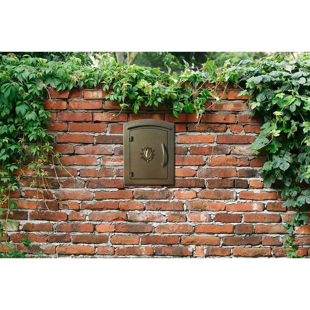 Add security to your Manchester by installing a chute that drops your mail out of reach of unwanted hands. The mail drops down to a locking rear door for easy collection. The chute is made of 16-Gauge powder coated steel and includes a separate compartment for outgoing mail. The faceplate features a tough Bronze powder coat finish with a decorative Agave Logo. (Maximum solid package mailbox can receive: 7.5 in. L x 7.5 in. W x 14 in. W) Please note the Manchester Newspaper Holder is not available with this option.