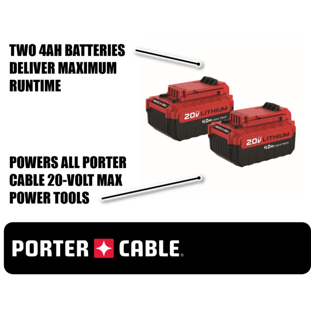 The 20-Volt MAX 4.0 Ah Lithium-Ion Battery features no memory loss and minimal self-discharge so the batteries are ready when needed. These batteries deliver maximum runtime for heavy-duty applications. They power all Porter-Cable 20-Volt MAX power tools.